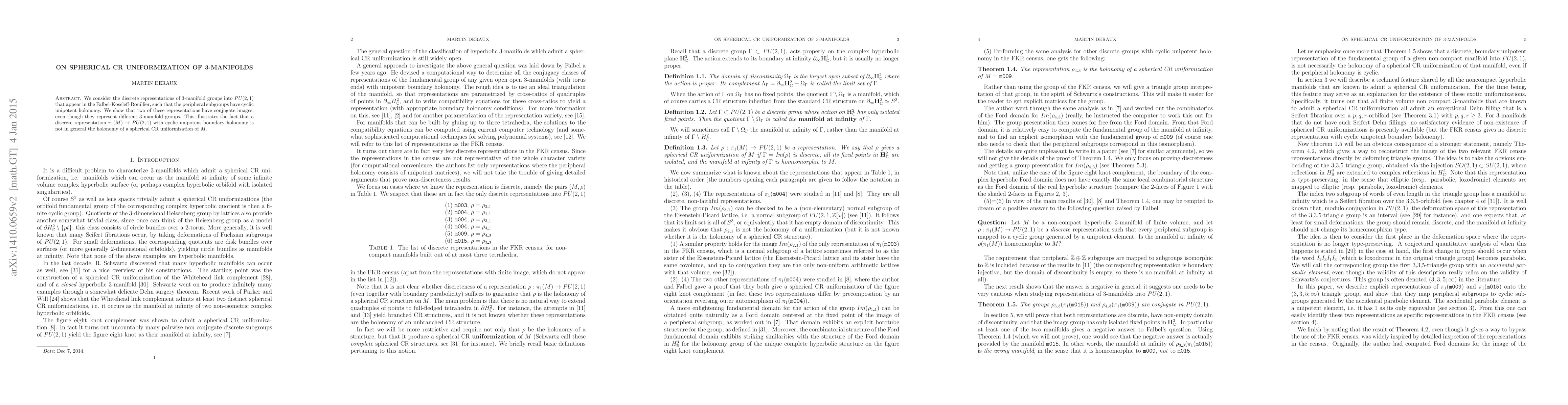We consider the discrete representations of 3-manifold groups into $PU(2,1)$ that appear in the Falbel-Koseleff-Rouillier census, such that the peripheral subgroups have cyclic unipotent holonomy. We show that two of these representations have conjugate images, even though they represent different 3-manifold groups. This illustrates the fact that a discrete representation $\pi_1(M)\rightarrow PU(2,1)$ with cyclic unipotent boundary holonomy is not in general the holonomy of a spherical CR uniformization of $M$.