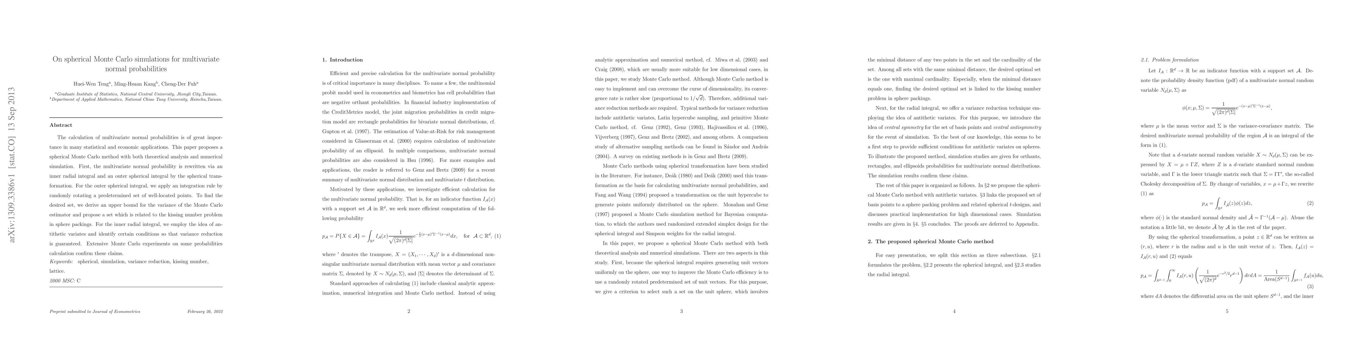 This paper proposes a new Monte Carlo method to quickly calculate multivariate normal probabilities, using spherical transformations and variance reduction techniques, offering improved efficiency over traditional methods.