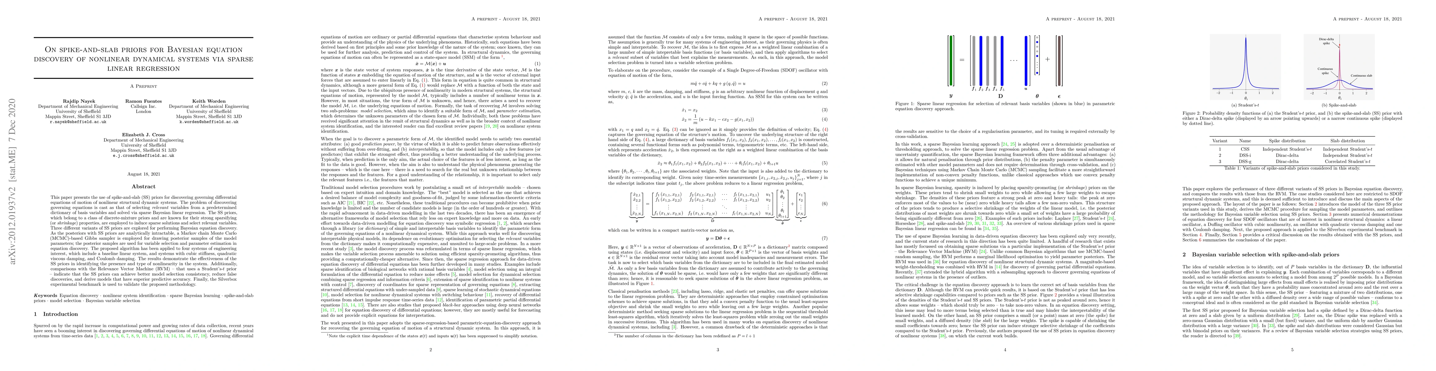 This paper utilizes spike-and-slab priors for discovering governing differential equations in nonlinear dynamical systems through sparse Bayesian linear regression. The method effectively identifies relevant variables and demonstrates superior model selection and predictive accuracy compared to the Relevance Vector Machine.