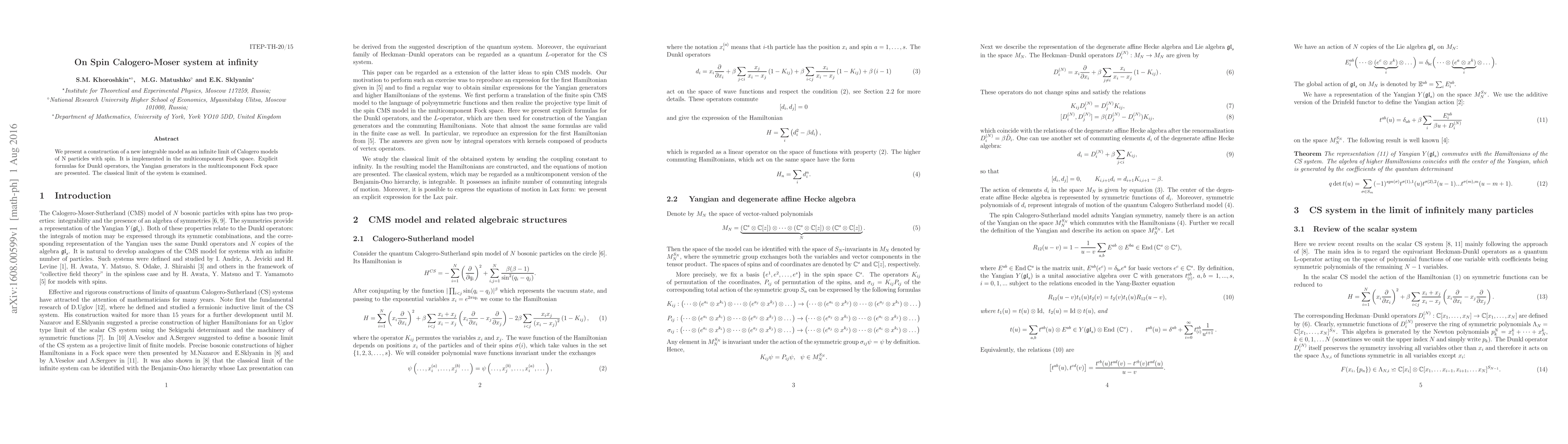 Researchers present a new integrable model as an infinite limit of Calogero models with spin particles, using the multicomponent Fock space to derive explicit formulas for Dunkl operators and Yangian generators. The classical limit of the system is also examined.