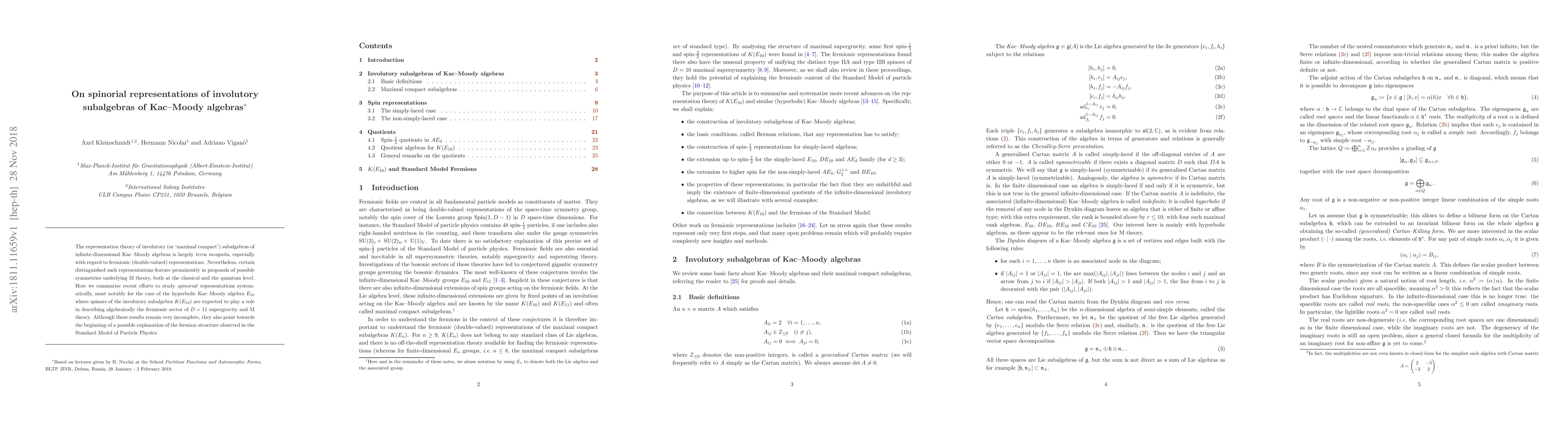 The representation theory of involutory (or 'maximal compact') subalgebras of infinite-dimensional Kac-Moody algebras is largely terra incognita, especially with regard to fermionic (double-valued) representations. Nevertheless, certain distinguished such representations feature prominently in proposals of possible symmetries underlying M theory, both at the classical and the quantum level. Here we summarise recent efforts to study spinorial representations systematically, most notably for the case of the hyperbolic Kac-Moody algebra $E_{10}$ where spinors of the involutory subalgebra $K(E_{10})$ are expected to play a role in describing algebraically the fermionic sector of $D=11$ supergravity and M theory. Although these results remain very incomplete, they also point towards the beginning of a possible explanation of the fermion structure observed in the Standard Model of Particle Physics.
