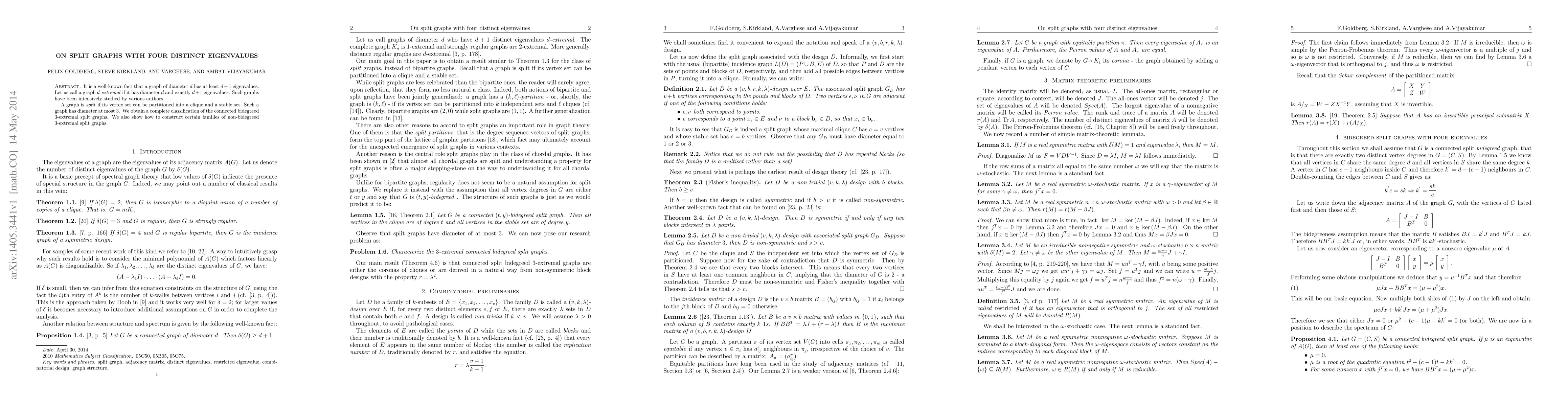 It is a well-known fact that a graph of diameter $d$ has at least $d+1$ eigenvalues. Let us call a graph \emph{$d$-extremal} if it has diameter $d$ and exactly $d+1$ eigenvalues. Such graphs have been intensively studied by various authors. %Much attention has been devoted to the study of graphs that are extremal with respect to this relation: \emph{i.e} have diameter $d$ and exactly $d+1$ distinct eigenvalues. A graph is \emph{split} if its vertex set can be partitioned into a clique and a stable set. Such a graph has diameter at most $3$. We obtain a complete classification of the connected bidegreed $3$-extremal split graphs. We also show how to construct certain families of non-bidegreed $3$-extremal split graphs.