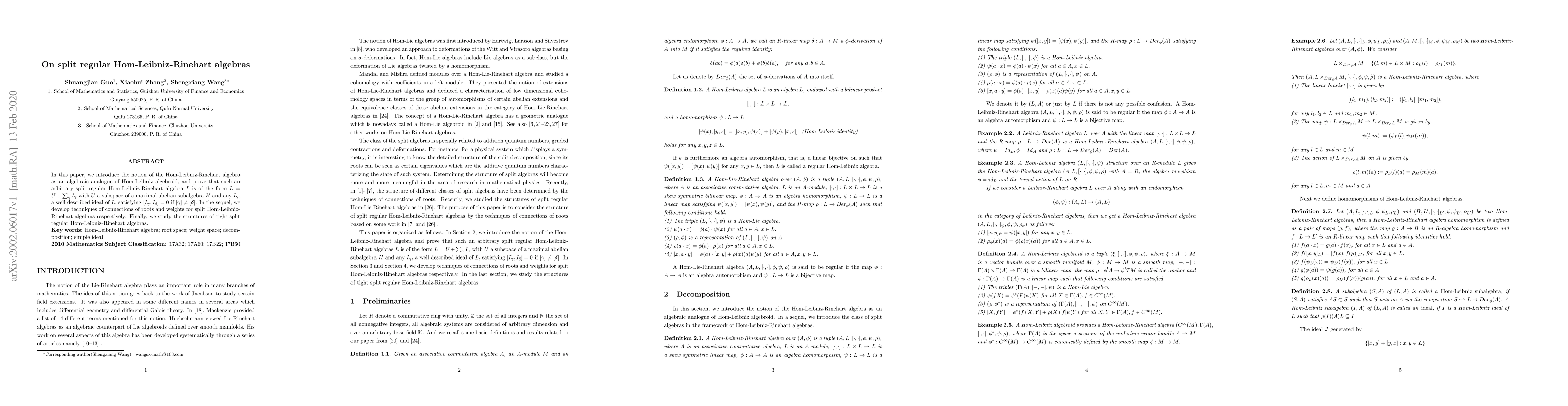 In this paper, we introduce the notion of the Hom-Leibniz-Rinehart algebra as an algebraic analogue of Hom-Leibniz algebroid, and prove that such an arbitrary split regular Hom-Leibniz-Rinehart algebra $L$ is of the form $L=U+\sum_\gamma I_\gamma$ with $U$ a subspace of a maximal abelian subalgebra $H$ and any $I_\gamma$, a well described ideal of $L$, satisfying $[I_\gamma, I_\delta]= 0$ if $[\gamma]\neq [\delta]$. In the sequel, we develop techniques of connections of roots and weights for split Hom-Leibniz-Rinehart algebras respectively. Finally, we study the structures of tight split regular Hom-Leibniz-Rinehart algebras.