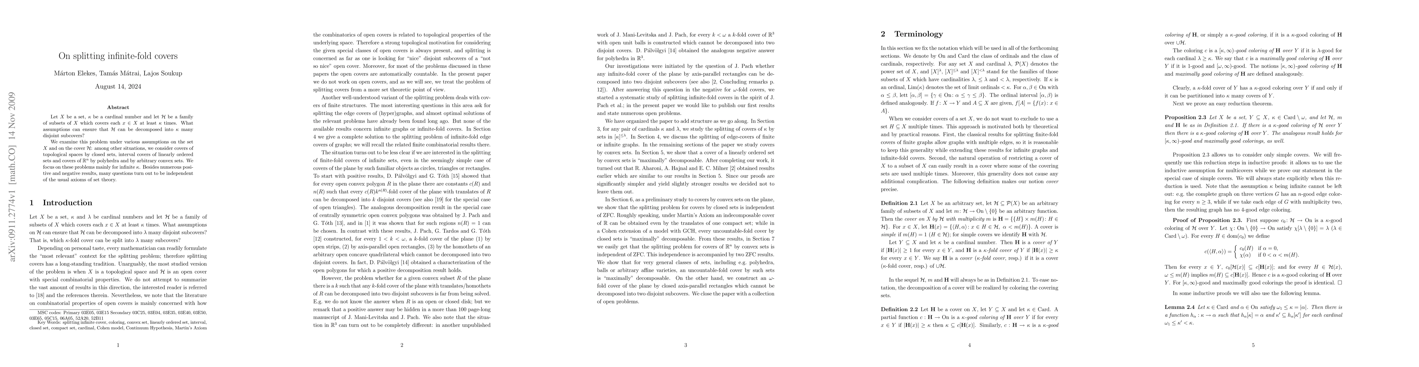 Let $X$ be a set, $\ka$ be a cardinal number and let $\iH$ be a family of subsets of $X$ which covers each $x\in X$ at least $\ka$ times. What assumptions can ensure that $\iH$ can be decomposed into $\kappa$ many disjoint subcovers? We examine this problem under various assumptions on the set $X$ and on the cover $\iH$: among other situations, we consider covers of topological spaces by closed sets, interval covers of linearly ordered sets and covers of $\real^{n}$ by polyhedra and by arbitrary convex sets. We focus on these problems mainly for infinite $\kappa$. Besides numerous positive and negative results, many questions turn out to be independent of the usual axioms of set theory.