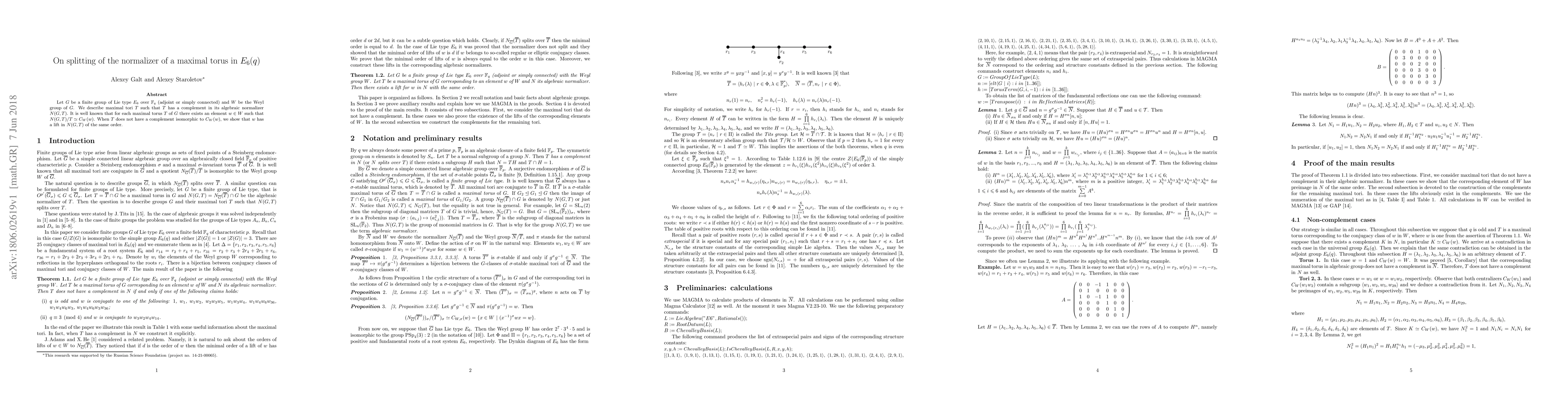 Let $G$ be a finite group of Lie type $E_6$ over $F_q$ (adjoint or simply connected) and $W$ be the Weyl group of $G$. We describe maximal tori $T$ such that $T$ has a complement in its algebraic normalizer $N(G,T)$. It is well known that for each maximal torus $T$ of $G$ there exists an element $w\in W$ such that $N(G,T)/T\simeq C_W(w)$. When $T$ does not have a complement isomorphic to $C_W(w)$, we show that $w$ has a lift in $N(G,T)$ of the same order.