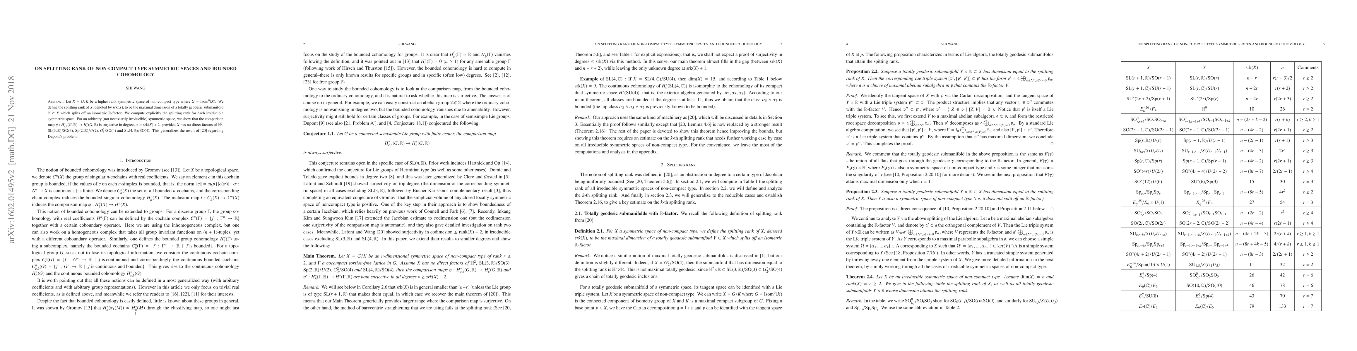Let $X=G/K$ be a higher rank symmetric space of non-compact type, where $G$ is the connected component of the isometry group of $X$. We define the splitting rank of $X$, denoted by $\text{srk}(X)$, to be the maximal dimension of a totally geodesic submanifold $Y\subset X$ which splits off an isometric $\mathbb R$-factor. We compute explicitly the splitting rank for each irreducible symmetric space. For an arbitrary (not necessarily irreducible) symmetric space, we show that the comparison map $\eta:H^{*}_{c,b}(G,\mathbb{R})\rightarrow H^{*}_c(G,\mathbb{R})$ is surjective in degrees $*\geq \text{srk}(X)+2$, provided $X$ has no small direct factors.