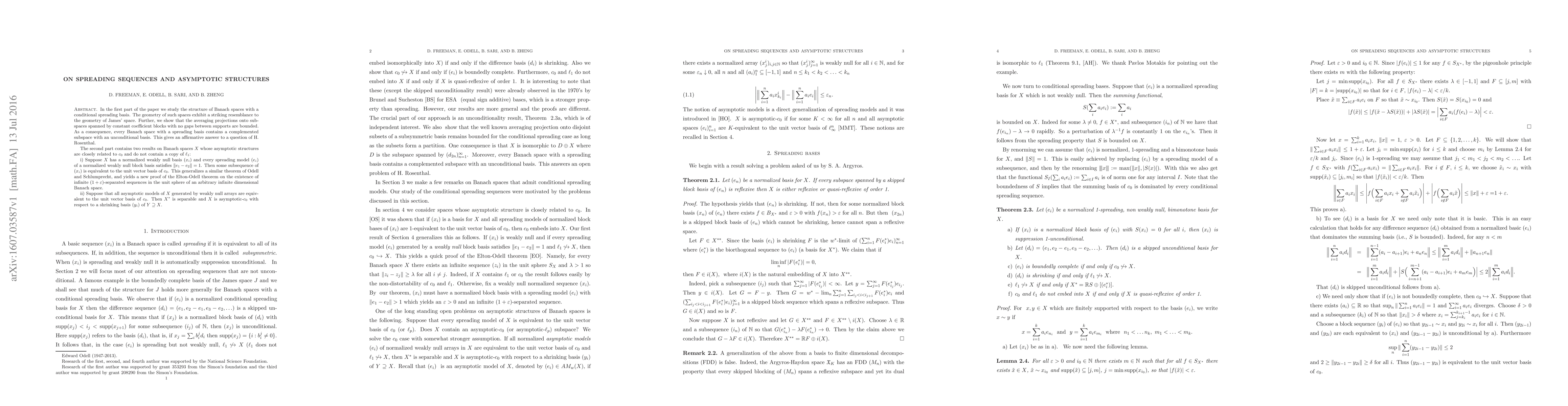In the first part of the paper we study the structure of Banach spaces with a conditional spreading basis. The geometry of such spaces exhibit a striking resemblance to the geometry of James' space. Further, we show that the averaging projections onto subspaces spanned by constant coefficient blocks with no gaps between supports are bounded. As a consequence, every Banach space with a spreading basis contains a complemented subspace with an unconditional basis. This gives an affirmative answer to a question of H. Rosenthal. The second part contains two results on Banach spaces $X$ whose asymptotic structures are closely related to $c_0$ and do not contain a copy of $\ell_1$: i) Suppose $X$ has a normalized weakly null basis $(x_i)$ and every spreading model $(e_i)$ of a normalized weakly null block basis satisfies $\|e_1-e_2\|=1$. Then some subsequence of $(x_i)$ is equivalent to the unit vector basis of $c_0$. This generalizes a similar theorem of Odell and Schlumprecht, and yields a new proof of the Elton-Odell theorem on the existence of infinite $(1+\varepsilon)$-separated sequences in the unit sphere of an arbitrary infinite dimensional Banach space. ii) Suppose that all asymptotic models of $X$ generated by weakly null arrays are equivalent to the unit vector basis of $c_0$. Then $X^*$ is separable and $X$ is asymptotic-$c_0$ with respect to a shrinking basis $(y_i)$ of $Y\supseteq X$.