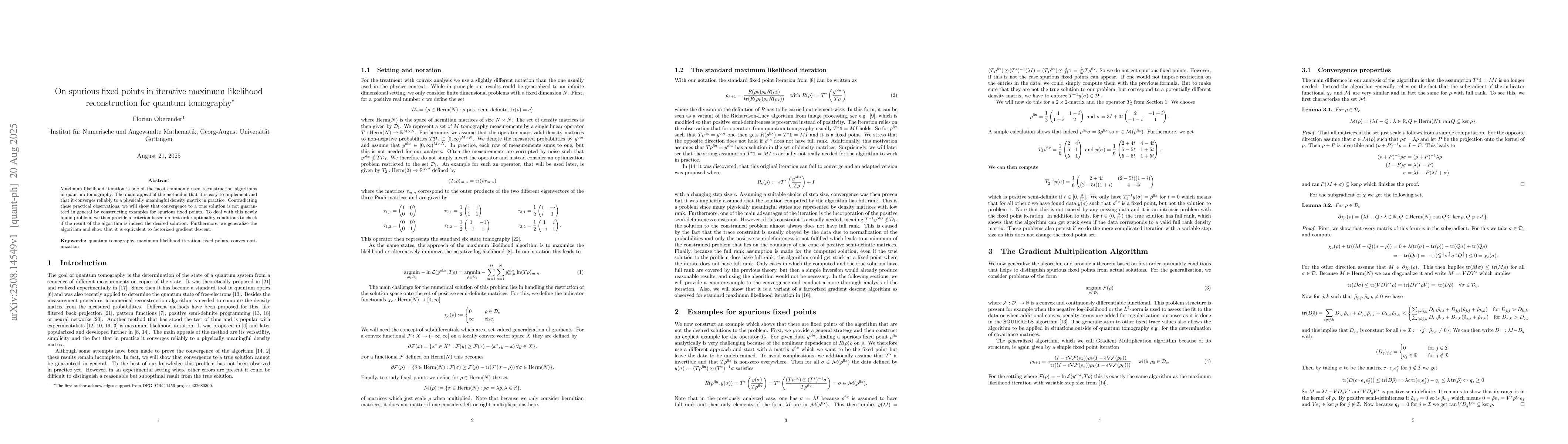 The paper analyzes iterative maximum likelihood reconstruction in quantum tomography, identifying spurious fixed points and providing a criterion to distinguish them from true solutions. It generalizes the algorithm and shows its equivalence to factorized gradient descent.