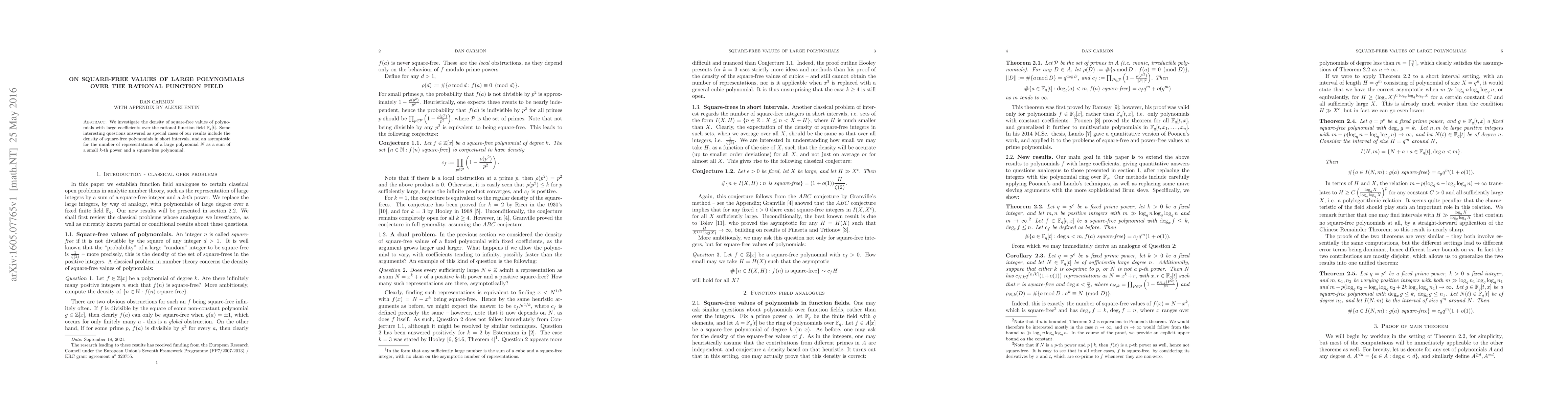 This paper studies the density of square-free values produced by large polynomials over the rational function field $\mathbb{F}_q[t]$. It also addresses the density of square-free polynomials in short intervals and provides an asymptotic formula for the number of $N$ representations as sums of small $k$-th powers and square-free polynomials.