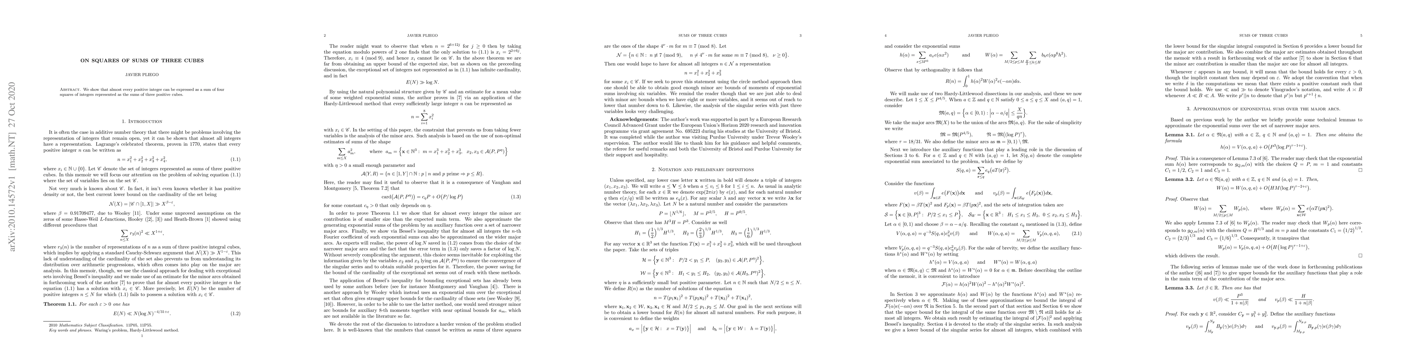 Summary: The research demonstrates that nearly all positive integers can be represented as the sum of four squares, each derived from the sum of three positive cubes. This finding highlights a novel connection between sums of cubes and squares in number theory.