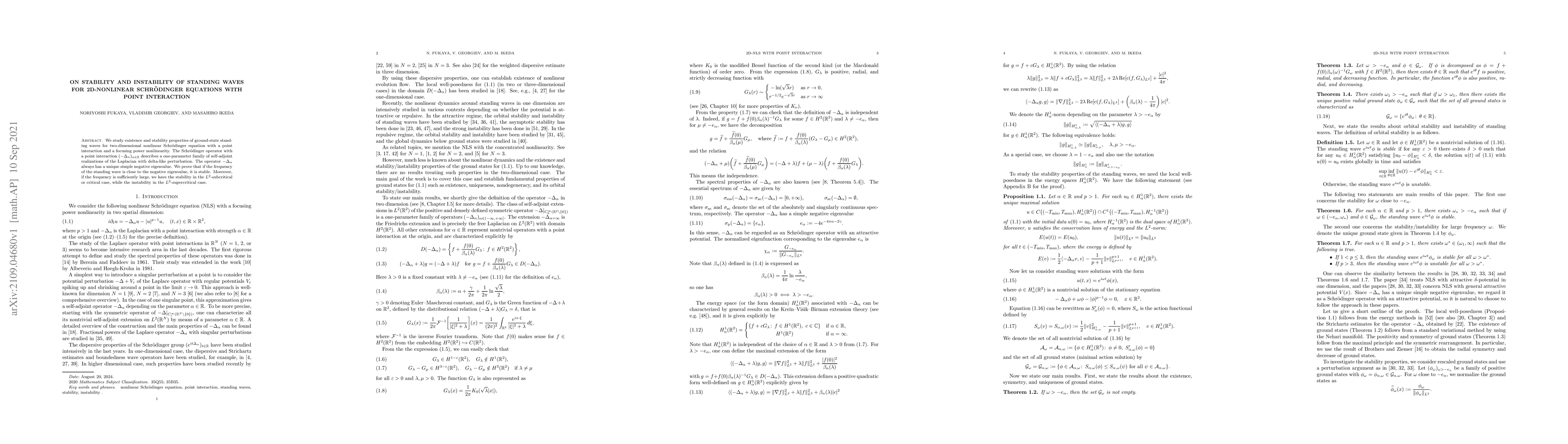 This paper investigates the existence and stability of ground-state standing waves for a two-dimensional nonlinear Schrödinger equation with point interaction. It finds that standing waves are stable when their frequency is close to the negative eigenvalue of the perturbed Laplacian, and unstable in the $L^2$-supercritical case.