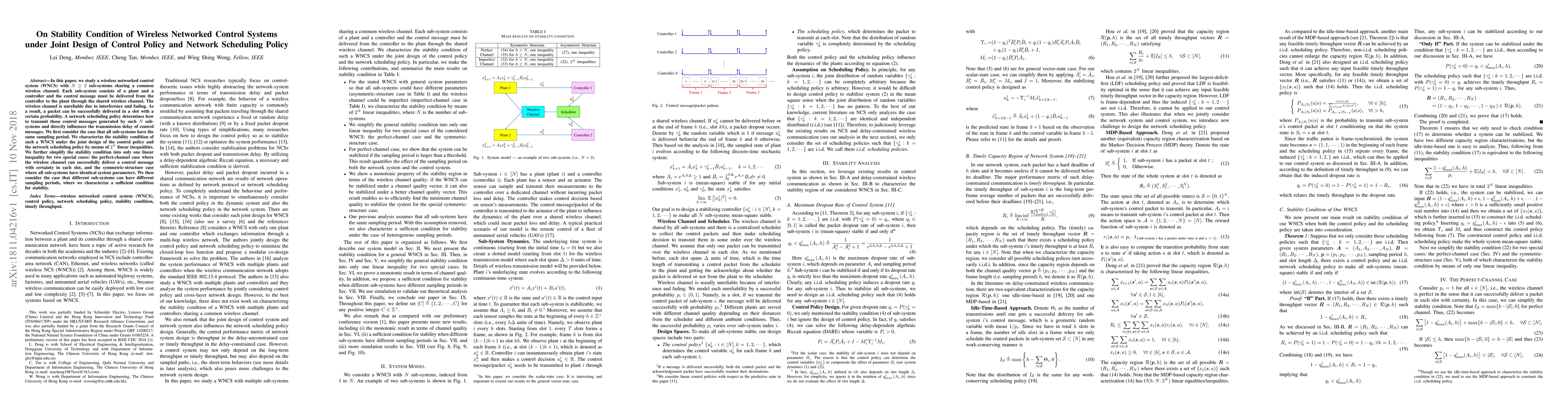 In this paper, we study a wireless networked control system (WNCS) with $N \ge 2$ sub-systems sharing a common wireless channel. Each sub-system consists of a plant and a controller and the control message must be delivered from the controller to the plant through the shared wireless channel. The wireless channel is unreliable due to interference and fading. As a result, a packet can be successfully delivered in a slot with a certain probability. A network scheduling policy determines how to transmit those control messages generated by such $N$ sub-systems and directly influences the transmission delay of control messages. We first consider the case that all sub-systems have the same sampling period. We characterize the stability condition of such a WNCS under the joint design of the control policy and the network scheduling policy by means of $2^N$ linear inequalities. We further simplify the stability condition into only one linear inequality for two special cases: the perfect-channel case where the wireless channel can successfully deliver a control message with certainty in each slot, and the symmetric-structure case where all sub-systems have identical system parameters. We then consider the case that different sub-systems can have different sampling periods, where we characterize a sufficient condition for stability.