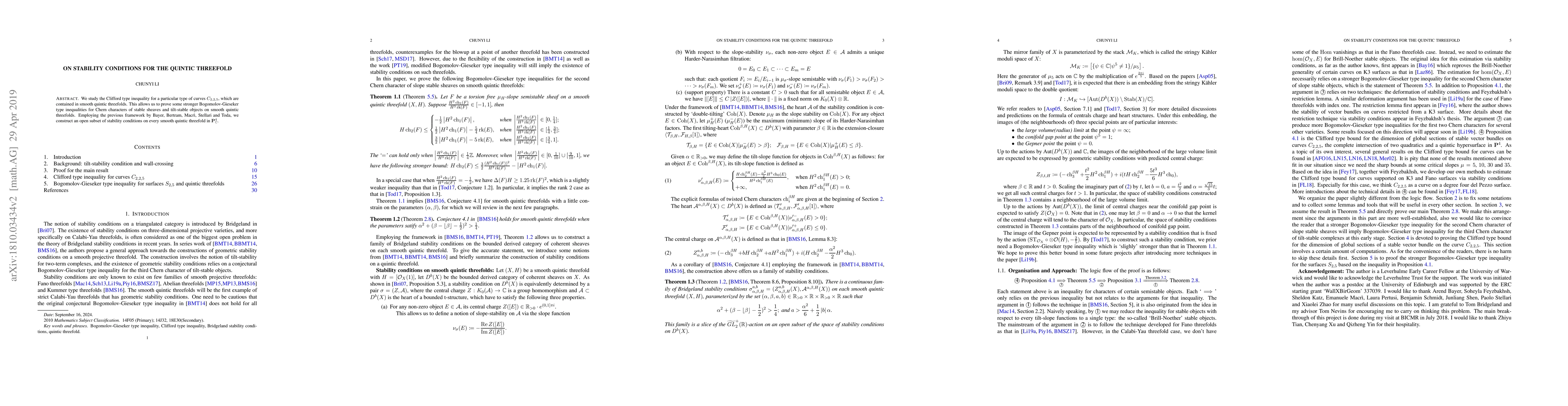 This paper investigates Clifford type inequalities for curves $C_{2,2,5}$ in smooth quintic threefolds, leading to stronger Bogomolov-Gieseker inequalities for stable sheaves. It constructs an open subset of stability conditions on these threefolds using a framework developed by Bayer et al.