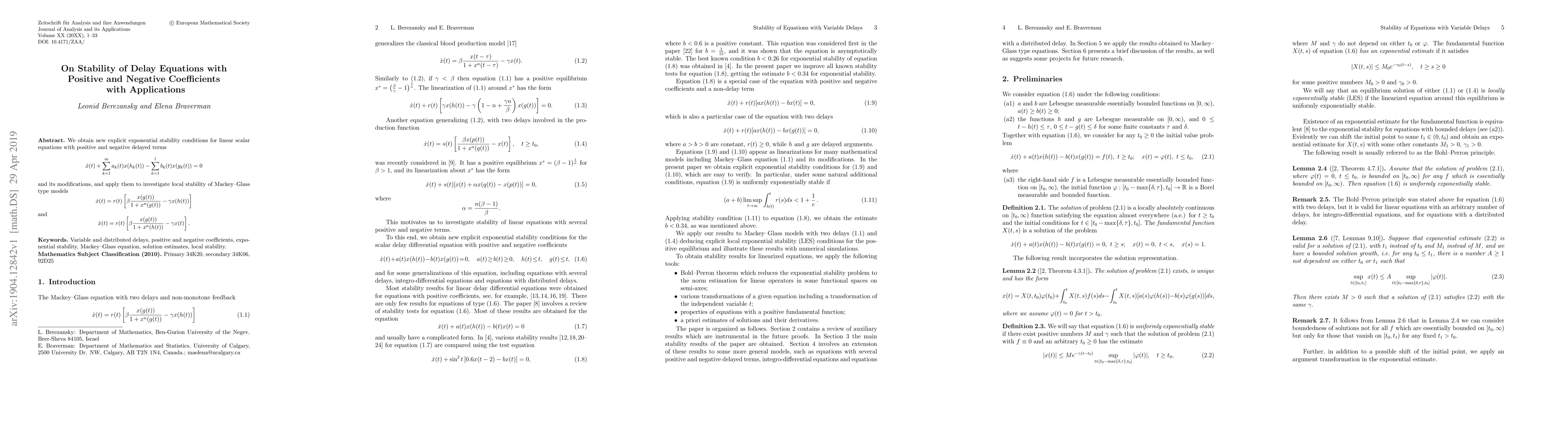 We obtain new explicit exponential stability conditions for linear scalar equations with positive and negative delayed terms $$ \dot{x}(t)+ \sum_{k=1}^m a_k(t)x(h_k(t))- \sum_{k=1}^l b_k(t)x(g_k(t))=0 $$ and its modifications, and apply them to investigate local stability of Mackey--Glass type models $$\dot{x}(t)=r(t)\left[\beta\frac{x(g(t))}{1+x^n(g(t))}-\gamma x(h(t))\right]$$ and $$\dot{x}(t)=r(t)\left[\beta\frac{x(g(t))}{1+x^n(h(t))}-\gamma x(t)\right].$$