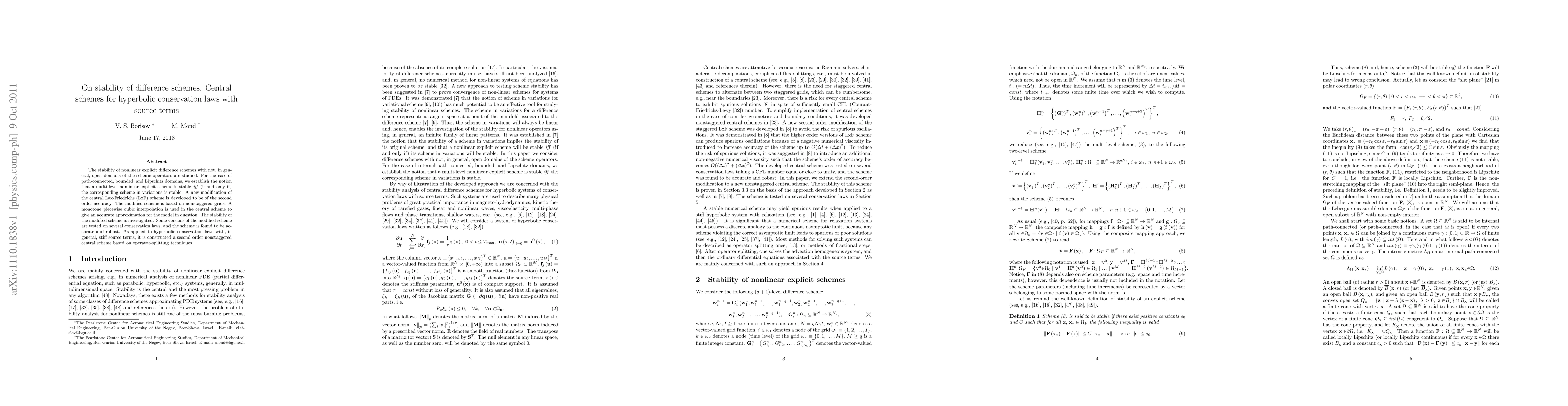 The stability of nonlinear explicit difference schemes with not, in general, open domains of the scheme operators are studied. For the case of path-connected, bounded, and Lipschitz domains, we establish the notion that a multi-level nonlinear explicit scheme is stable iff (if and only if) the corresponding scheme in variations is stable. A new modification of the central Lax-Friedrichs (LxF) scheme is developed to be of the second order accuracy. The modified scheme is based on nonstaggered grids. A monotone piecewise cubic interpolation is used in the central scheme to give an accurate approximation for the model in question. The stability of the modified scheme is investigated. Some versions of the modified scheme are tested on several conservation laws, and the scheme is found to be accurate and robust. As applied to hyperbolic conservation laws with, in general, stiff source terms, it is constructed a second order nonstaggered central scheme based on operator-splitting techniques.
