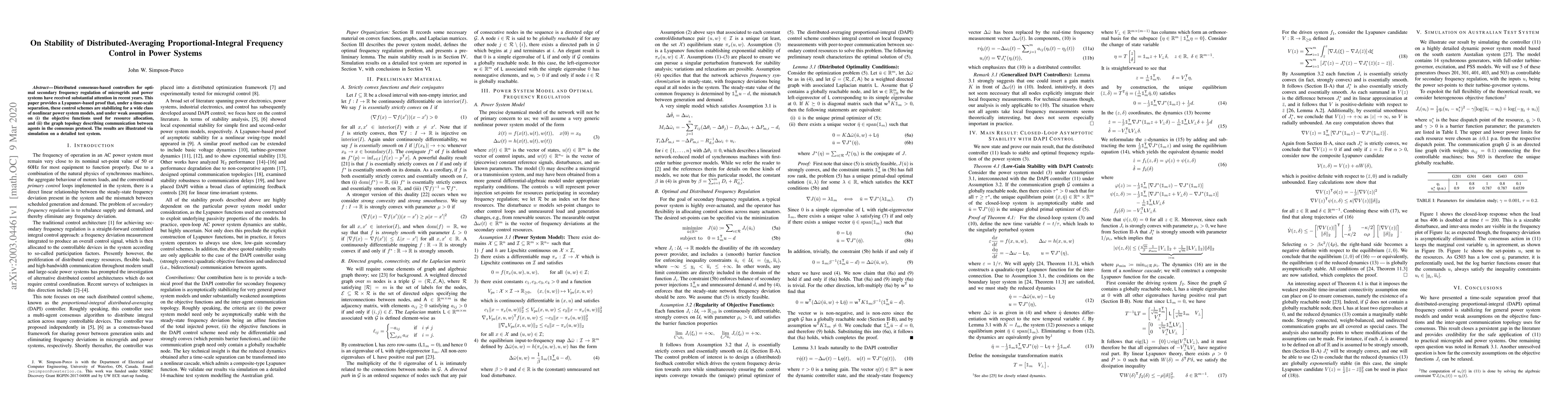 This paper proves that distributed consensus-based controllers for power systems are stabilizing under certain conditions, using a Lyapunov-based proof and simulation on a test system.