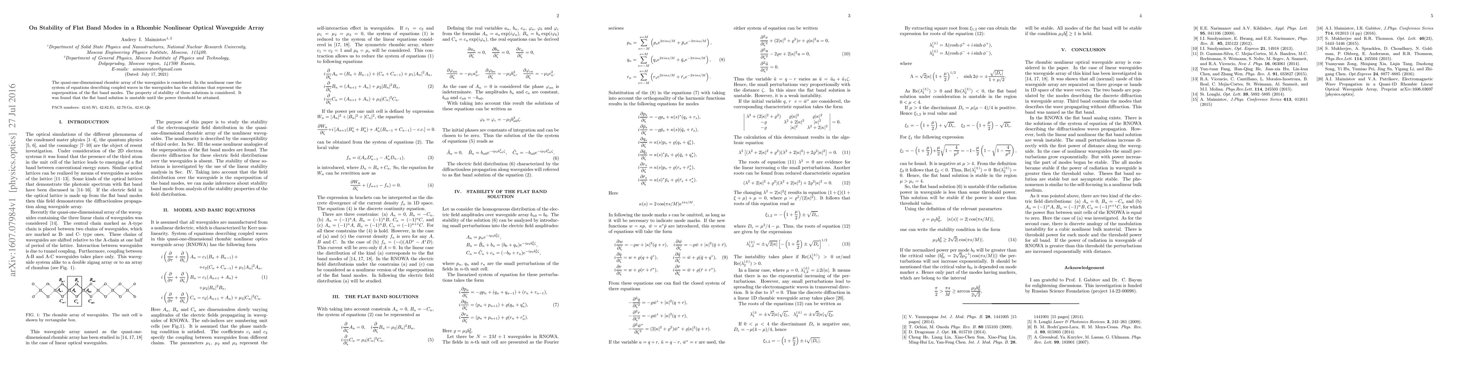 This paper investigates the stability of flat band modes in a quasi-one-dimensional rhombic array of nonlinear optical waveguides. The study reveals that these flat band solutions are unstable until a certain power threshold is reached.