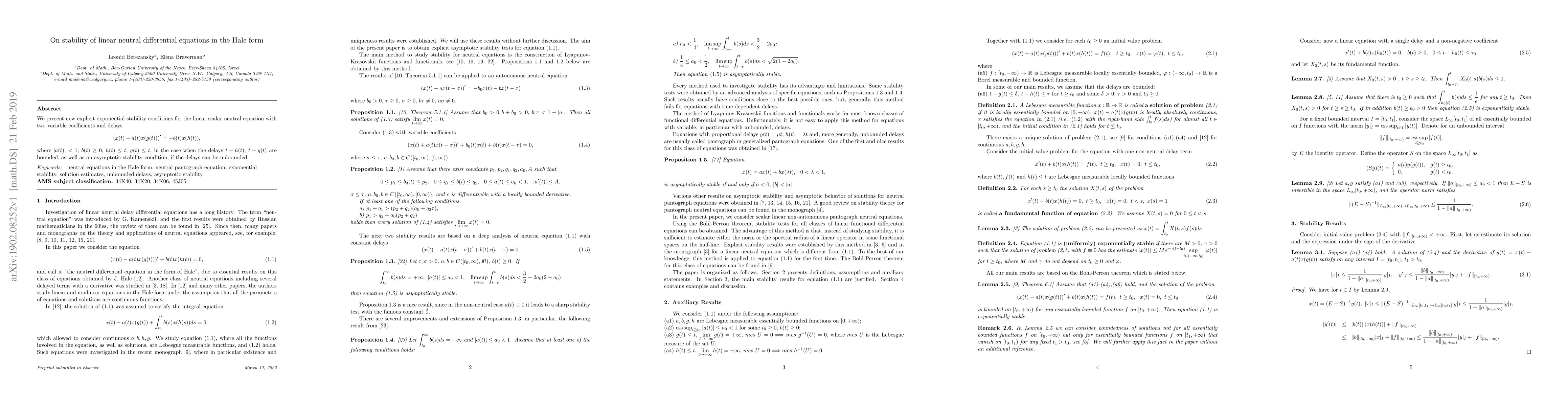 We present new explicit exponential stability conditions for the linear scalar neutral equation with two variable coefficients and delays $$ (x(t)-a(t)x(g(t)))'=-b(t)x(h(t)), $$ where $|a(t)|<1$, $b(t)\geq 0$, $h(t)\leq t$, $g(t)\leq t$, in the case when the delays $t-h(t)$, $t-g(t)$ are bounded, as well as an asymptotic stability condition, if the delays can be unbounded.