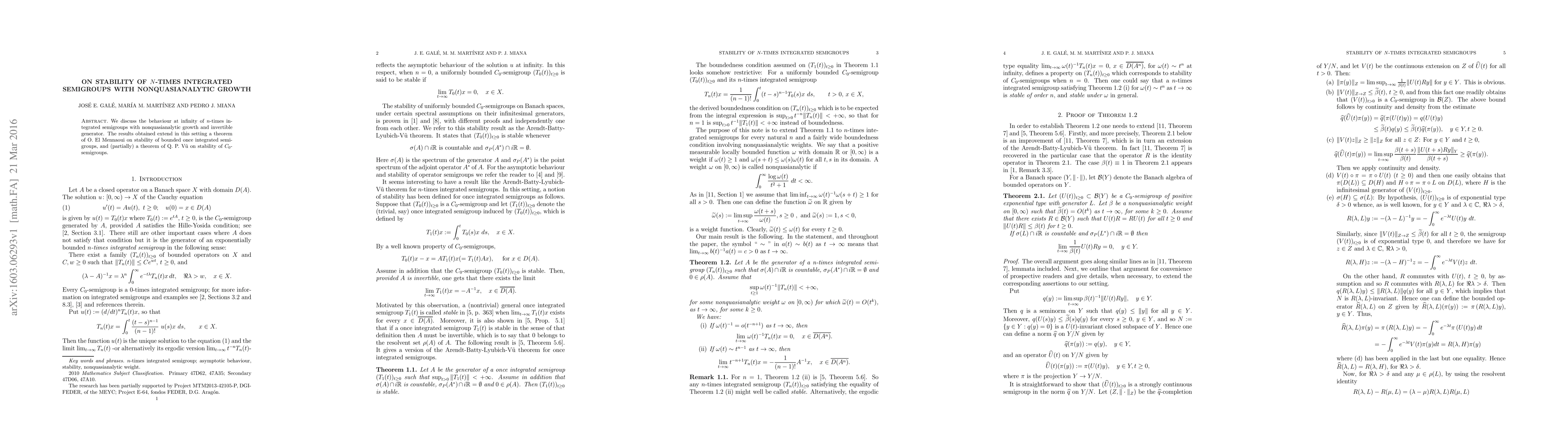 We discuss the behaviour at infinity of $n$-times integrated semigroups with nonquasianalytic growth and invertible generator. The results obtained extend in this setting a theorem of O. El Mennaoui on stability of bounded once integrated semigroups, and (partially) a theorem of Q. P. V$\tilde{\rm u}$ on stability of $C_0$-semigroups.
