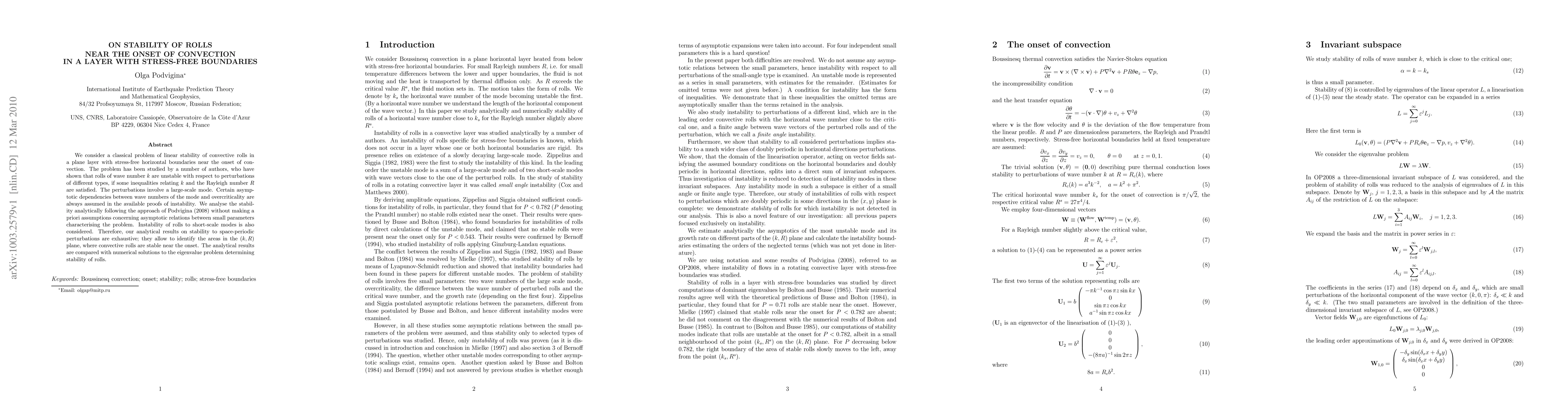 We consider a classical problem of linear stability of convective rolls in a plane layer with stress-free horizontal boundaries near the onset of convection. The problem has been studied by a number of authors, who have shown that rolls of wave number $k$ are unstable with respect to perturbations of different types, if some inequalities relating $k$ and the Rayleigh number $R$ are satisfied. The perturbations involve a large-scale mode. Certain asymptotic dependencies between wave numbers of the mode and overcriticality are always assumed in the available proofs of instability. We analyse the stability analytically following the approach of Podvigina (2008) without making a priori assumptions concerning asymptotic relations between small parameters characterising the problem. Instability of rolls to short-scale modes is also considered. Therefore, our analytical results on stability to space-periodic perturbations are exhaustive; they allow to identify the areas in the $(k,R)$ plane, where convective rolls are stable near the onset. The analytical results are compared with numerical solutions to the eigenvalue problem determining stability of rolls.