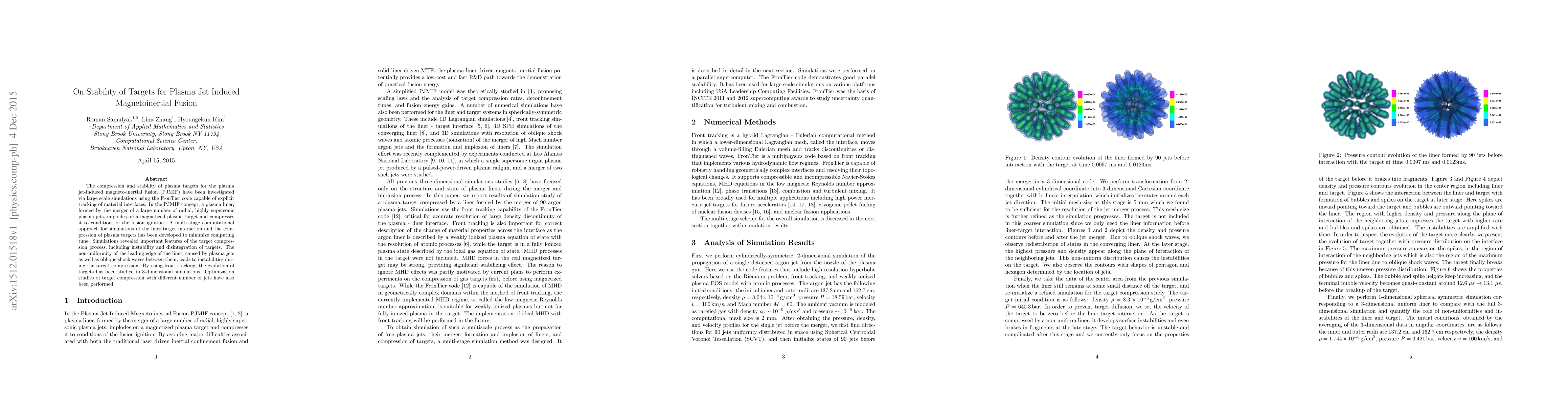 The compression and stability of plasma targets for the plasma jet-induced magneto-inertial fusion (PJMIF) have been investigated via large scale simulations using the FronTier code capable of explicit tracking of material interfaces. In the PJMIF concept, a plasma liner, formed by the merger of a large number of radial, highly supersonic plasma jets, implodes on a magnetized plasma target and compresses it to conditions of the fusion ignition. A multi-stage computational approach for simulations of the liner-target interaction and the compression of plasma targets has been developed to minimize computing time. Simulations revealed important features of the target compression process, including instability and disintegration of targets. The non-uniformity of the leading edge of the liner, caused by plasma jets as well as oblique shock waves between them, leads to instabilities during the target compression. By using front tracking, the evolution of targets has been studied in 3-dimensional simulations. Optimization studies of target compression with different number of jets have also been performed.