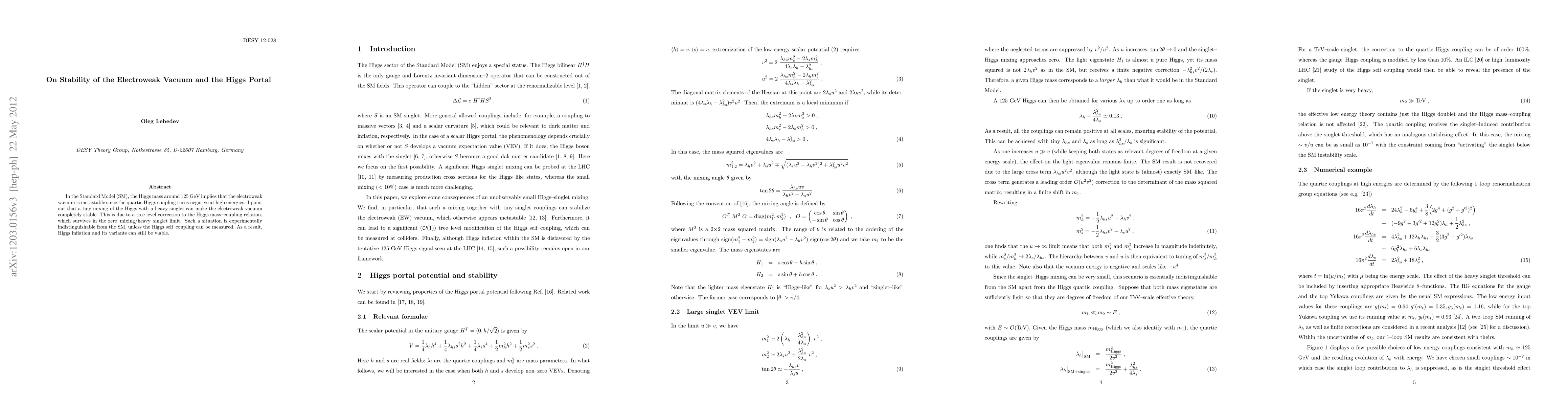 In the Standard Model (SM), the Higgs mass around 125 GeV implies that the electroweak vacuum is metastable since the quartic Higgs coupling turns negative at high energies. I point out that a tiny mixing of the Higgs with a heavy singlet can make the electroweak vacuum completely stable. This is due to a tree level correction to the Higgs mass-coupling relation, which survives in the zero-mixing/heavy-singlet limit. Such a situation is experimentally indistinguishable from the SM, unless the Higgs self-coupling can be measured. As a result, Higgs inflation and its variants can still be viable.