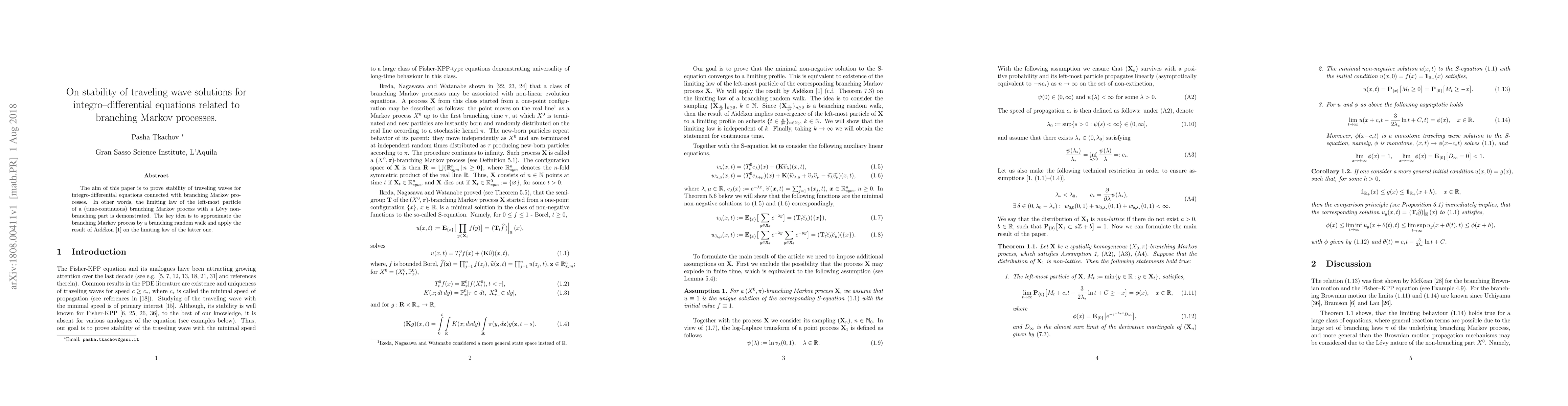 This paper proves the stability of traveling wave solutions for integro-differential equations linked to branching Markov processes. It demonstrates the limiting law of the left-most particle by approximating the process with a branching random walk and applying a relevant result from Aïdékon.