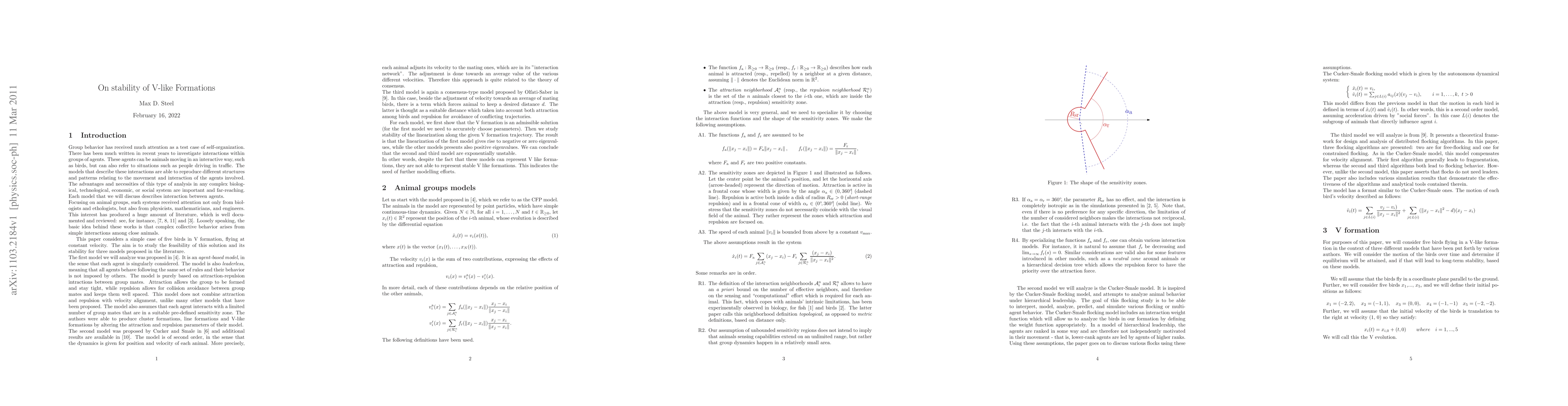 Group behavior has received much attention as a test case of self-organization. There has been much written in recent years to investigate interactions within groups of agents. These agents can be animals moving in an interactive way, such as birds, but can also refer to situations such as people driving in traffic. The models that describe these interactions are able to reproduce different structures and patterns relating to the movement and interaction of the agents involved. The advantages and necessities of this type of analysis in any complex biological, technological, economic, or social system are important and far-reaching. Each model that we will discuss describes interaction between agents.