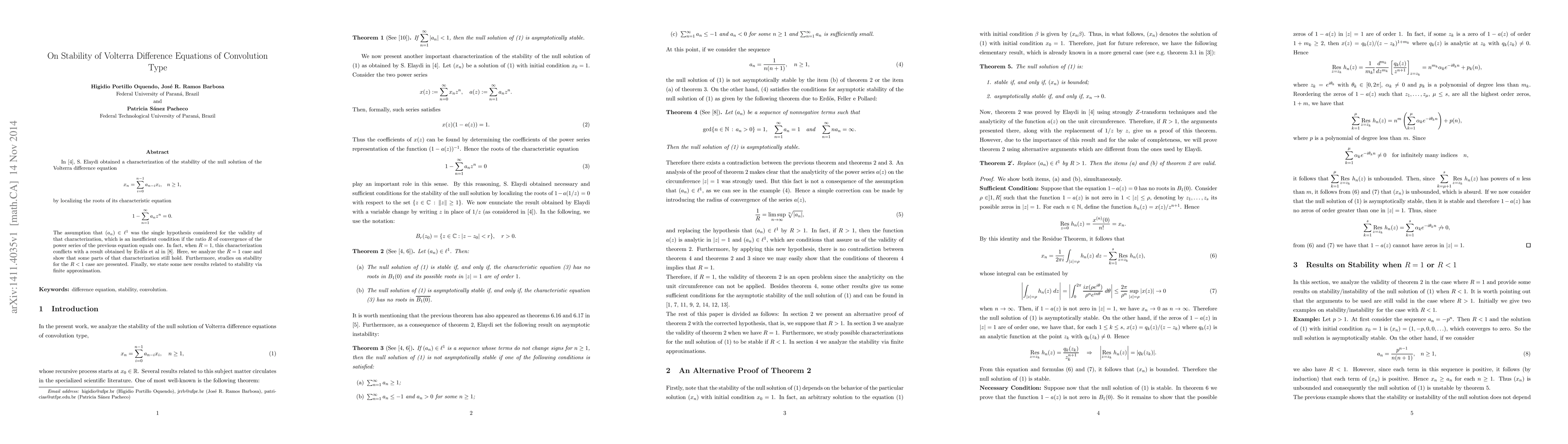 S. Elaydi obtained a characterization of the stability of the null solution of the Volterra difference equation $$ x_n=\sum_{i=0}^{n-1} a_{n-i} x_i\textrm{,}\quad n\geq 1\textrm{,} $$ by localizing the roots of its characteristic equation $$ 1-\sum_{n=1}^{\infty}a_nz^n=0\textrm{.} $$ The assumption that $(a_n)\in\ell^1$ was the single hypothesis considered for the validity of that characterization, which is an insufficient condition if the ratio $R$ of convergence of the power series of the previous equation equals one. In fact, when $R=1$, this characterization conflicts with a result obtained by Erd\"os, Feller and Pollard. Here, we analyze the $R=1$ case and show that some parts of that characterization still hold. Furthermore, studies on stability for the $R<1$ case are presented. Finally, we state some new results related to stability via finite approximation.