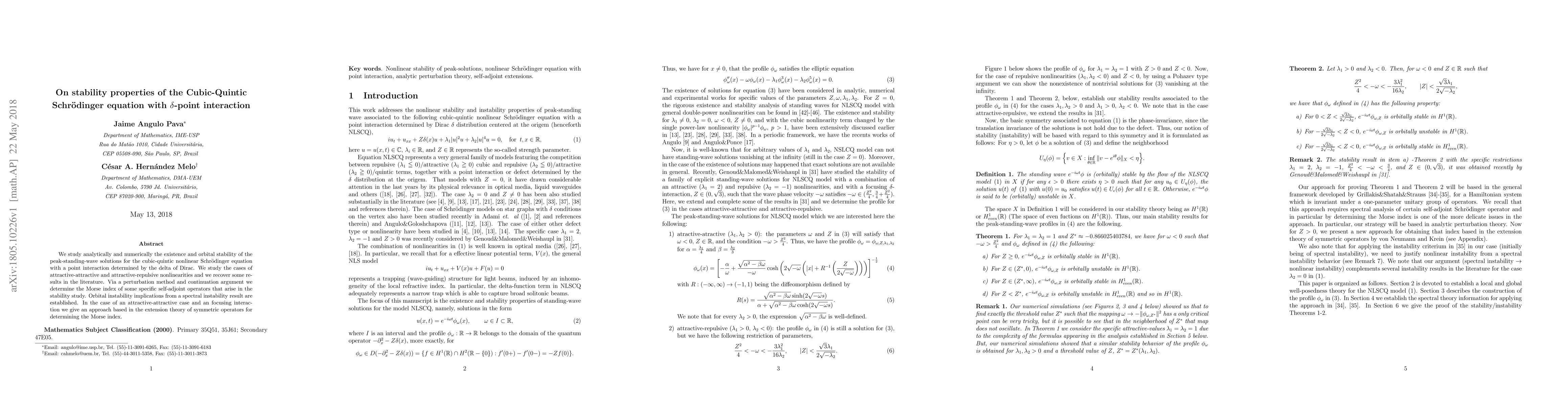 We study analytically and numerically the existence and orbital stability of the peak-standing-wave solutions for the cubic-quintic nonlinear Schrodinger equation with a point interaction determined by the delta of Dirac. We study the cases of attractive-attractive and attractive-repulsive nonlinearities and we recover some results in the literature. Via a perturbation method and continuation argument we determine the Morse index of some specific self-adjoint operators that arise in the stability study. Orbital instability implications from a spectral instability result are established. In the case of an attractive-attractive case and an focusing interaction we give an approach based in the extension theory of symmetric operators for determining the Morse index.