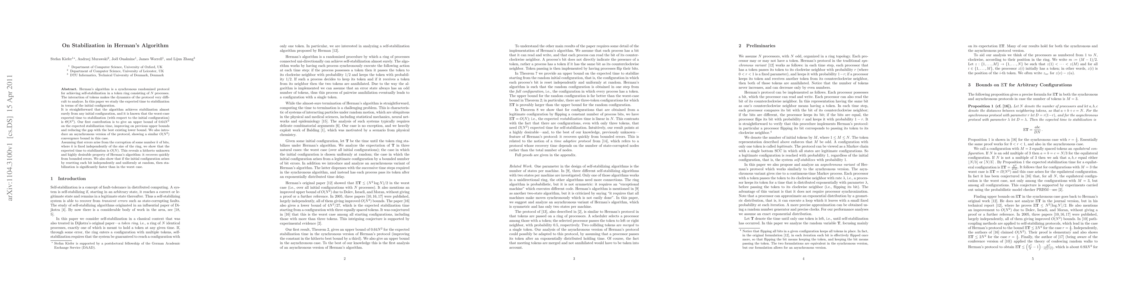 The paper analyzes Herman's algorithm for self-stabilization in token rings using both synchronous and asynchronous versions, focusing on the expected time to stabilization (ET) in terms of initial configurations.