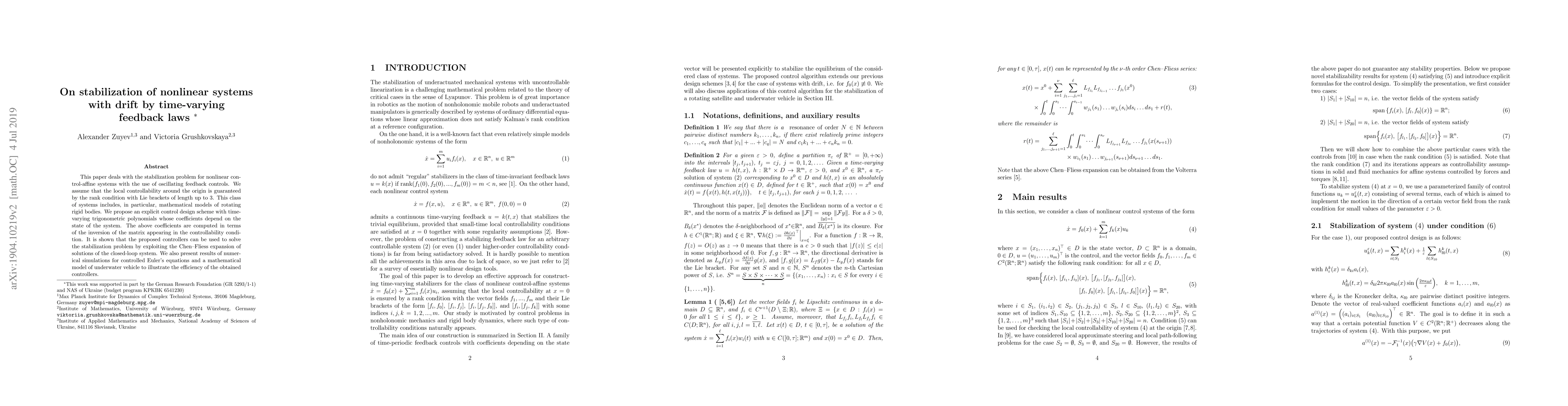 This paper proposes a time-varying feedback control scheme using trigonometric polynomials for stabilizing nonlinear control-affine systems, ensuring stabilization through the inversion of controllability matrices and validated by simulations on Euler's equations and an underwater vehicle model.