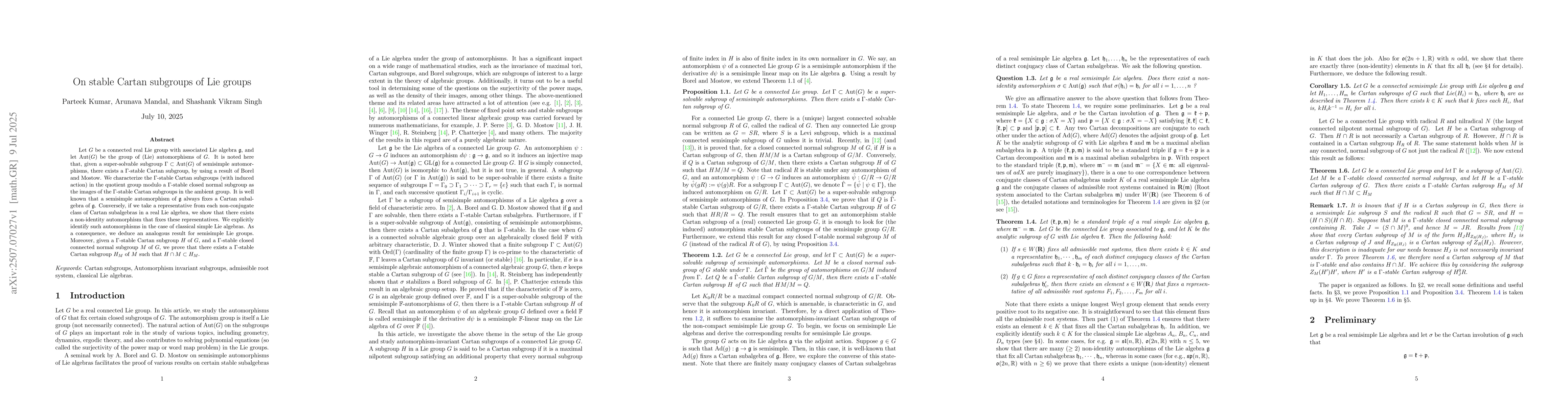 Let $G$ be a connected real Lie group with associated Lie algebra $\mathfrak g$, and let ${\rm Aut}(G)$ be the group of (Lie) automorphisms of $G$. It is noted here that, given a super-solvable subgroup $\Gamma\subset {\rm Aut}(G)$ of semisimple automorphisms, there exists a $\Gamma$-stable Cartan subgroup, by using a result of Borel and Mostow. We characterize the $\Gamma$-stable Cartan subgroups (with induced action) in the quotient group modulo a $\Gamma$-stable closed normal subgroup as the images of the $\Gamma$-stable Cartan subgroups in the ambient group. It is well known that a semisimple automorphism of $\mathfrak g$ always fixes a Cartan subalgebra of $\mathfrak g$. Conversely, if we take a representative from each non-conjugate class of Cartan subalgebras in a real Lie algebra, we show that there exists a non-identity automorphism that fixes these representatives. We explicitly identify such automorphisms in the case of classical simple Lie algebras. As a consequence, we deduce an analogous result for semisimple Lie groups. Moreover, given a $\Gamma$-stable Cartan subgroup $H$ of $G$, and a $\Gamma$-stable closed connected normal subgroup $M$ of $G$, we prove that there exists a $\Gamma$-stable Cartan subgroup $H_M$ of $M$ such that $H\cap M\subset H_M$.
