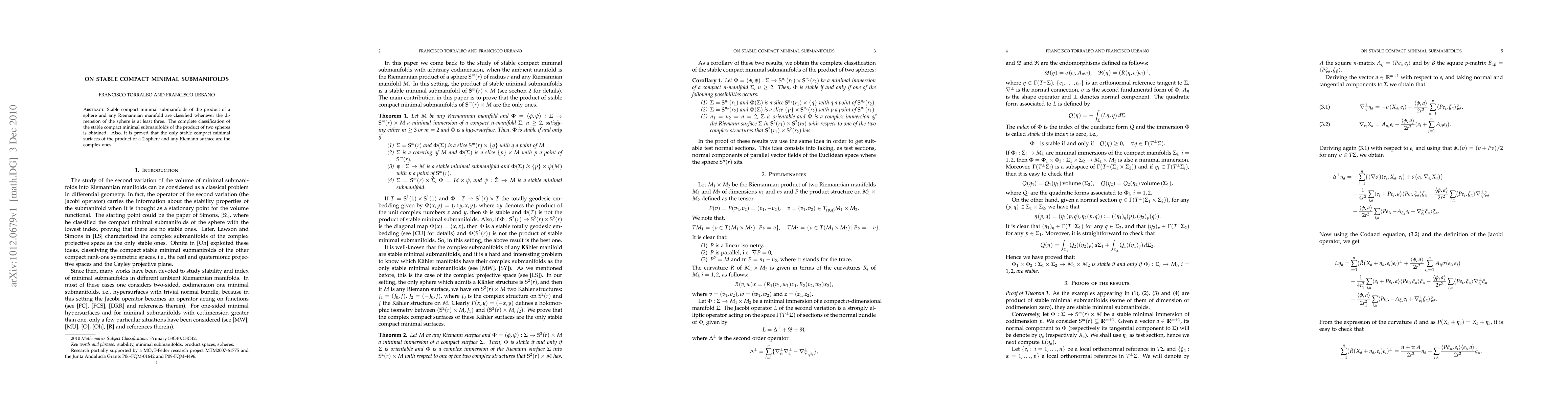 This paper classifies stable compact minimal submanifolds in the product of a sphere and any Riemannian manifold when the sphere's dimension is at least three. It also fully classifies these submanifolds in the product of two spheres and proves that the only stable compact minimal surfaces in the product of a 2-sphere and any Riemann surface are complex ones.