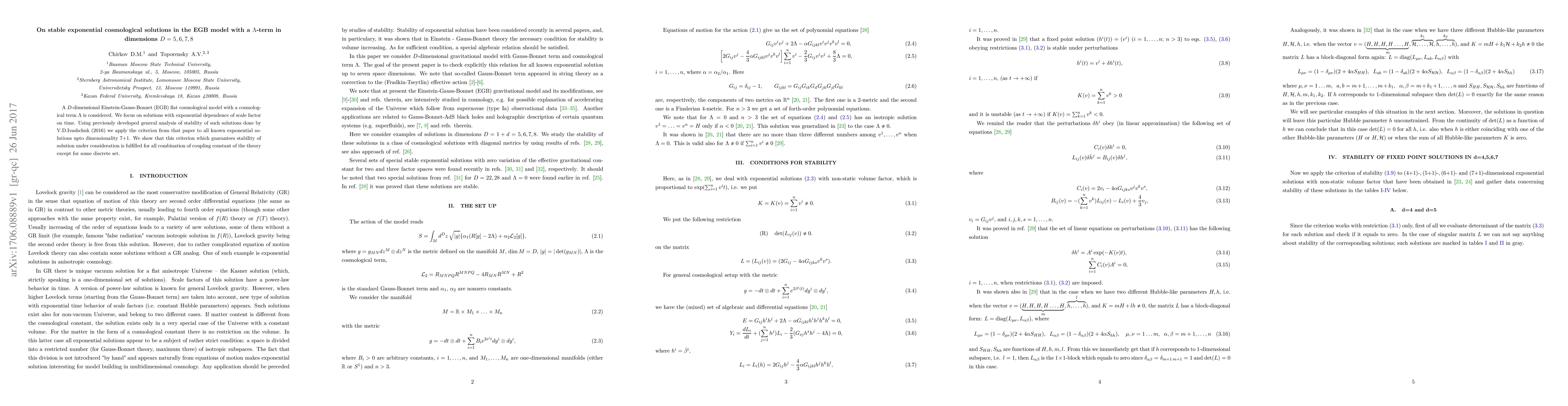 This paper examines $D$-dimensional Einstein-Gauss-Bonnet cosmological models with a cosmological constant $\Lambda$, focusing on stable exponential solutions. It applies a stability criterion from Ivashchuk (2016) to determine that stability is generally achieved for most coupling constants, except for specific cases.