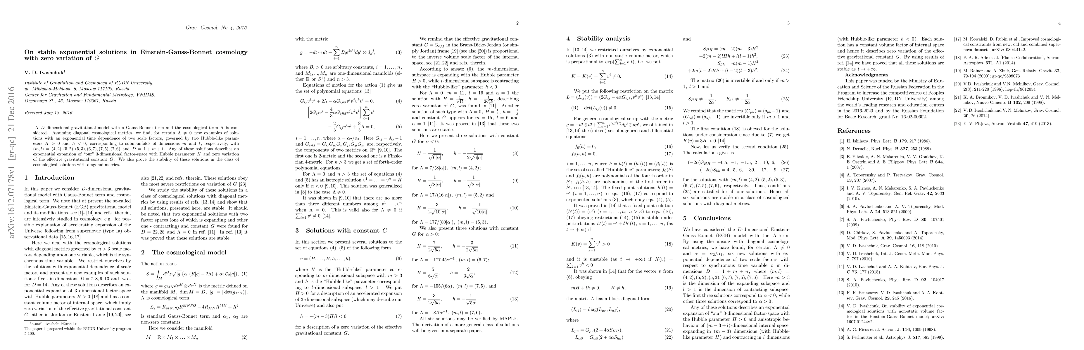 A D-dimensional gravitational model with a Gauss-Bonnet term and the cosmological term Lambda is considered. Assuming diagonal cosmological metrics, we find, for certain non-zero Lambda new examples of solutions with an exponential time dependence of two scale factors, governed by two Hubble-like parameters H > 0 and h < 0, corresponding to submanifolds of dimensions m and l, respectively, with (m,l) = (4,2), (5,2), (5,3), (6,7), (7,5), (7,6) and D = 1 + m + l. Any of these solutions describes an exponential expansion of "our" 3-dimensional factor-space with Hubble parameter H and zero variation of the effective gravitational constant G. We also prove the stability of these solutions in the class of cosmological solutions with diagonal metrics.
