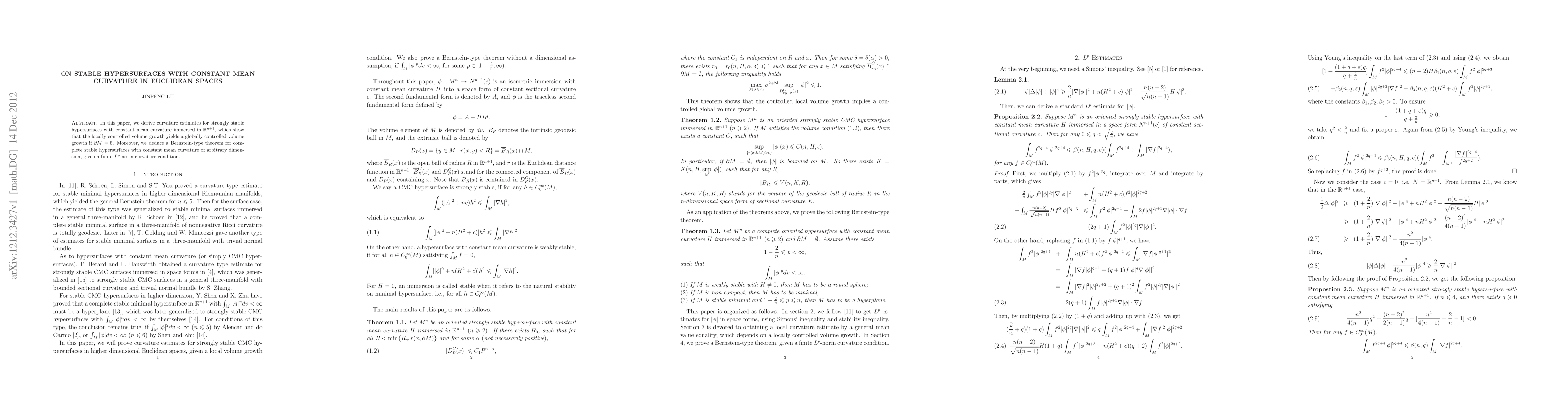 This paper provides curvature estimates for strongly stable hypersurfaces with constant mean curvature in Euclidean spaces, demonstrating that locally controlled volume growth leads to globally controlled volume growth when the hypersurface boundary is empty. It also establishes a Bernstein-type theorem for complete stable hypersurfaces under a finite $L^p$-norm curvature condition.