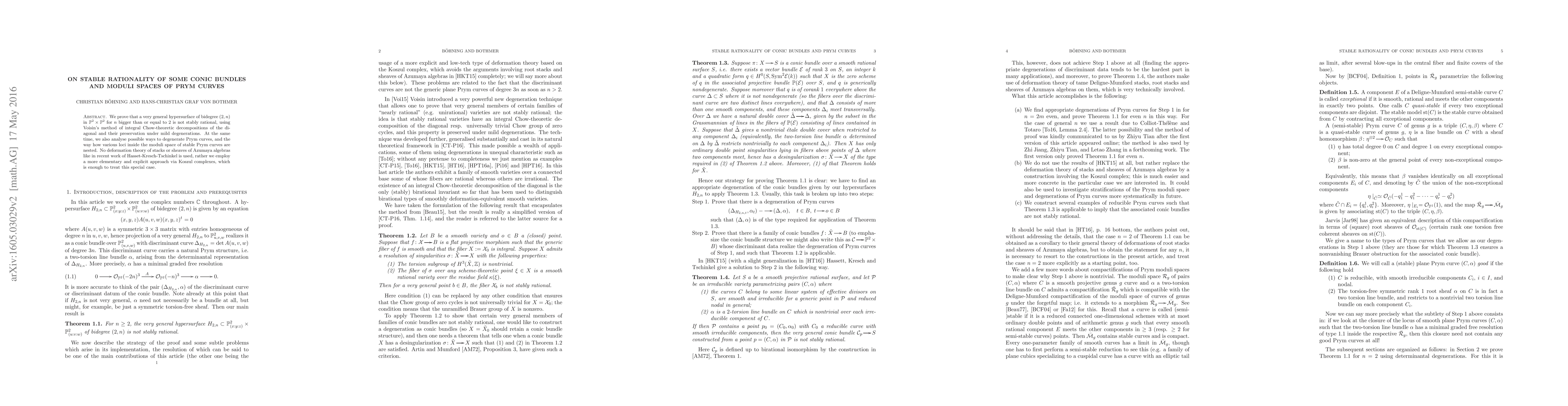 Summary: The paper proves that a general hypersurface in P^2 x P^2 with bidegree (2, n) for n ≥ 2 is not stably rational, using integral Chow-theoretic decompositions. It also examines the degeneration of Prym curves and the nesting of loci within the moduli space of stable Prym curves, employing an explicit approach via Koszul complexes.