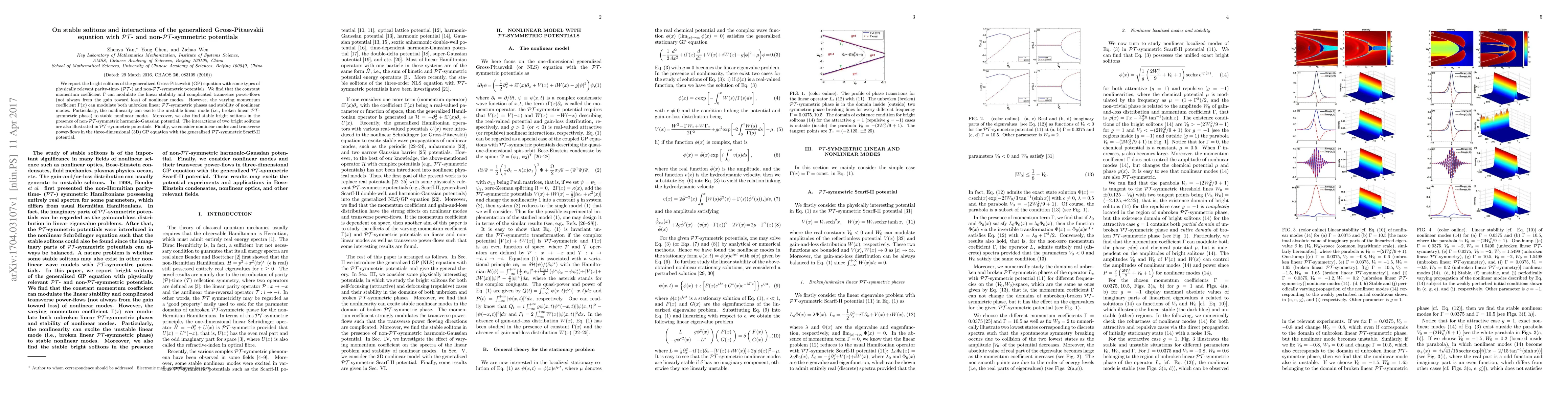 This paper investigates bright solitons in the generalized Gross-Pitaevskii equation under PT-symmetric and non-PT-symmetric potentials, finding that momentum modulation impacts stability and power flows. It highlights the potential for unstable linear modes to become stable nonlinear solitons and demonstrates stable soliton interactions in PT-symmetric settings.