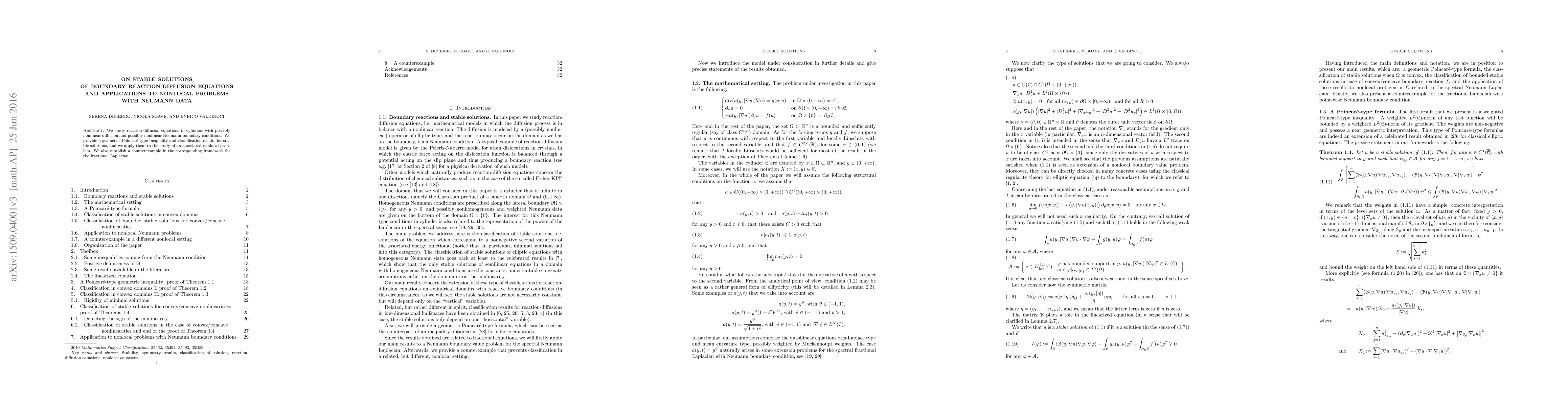 This paper explores reaction-diffusion equations with nonlinear diffusion and Neumann boundary conditions, providing a geometric Poincaré-type inequality and classification of stable solutions. It applies these results to a nonlocal problem and includes a counterexample for the fractional Laplacian.