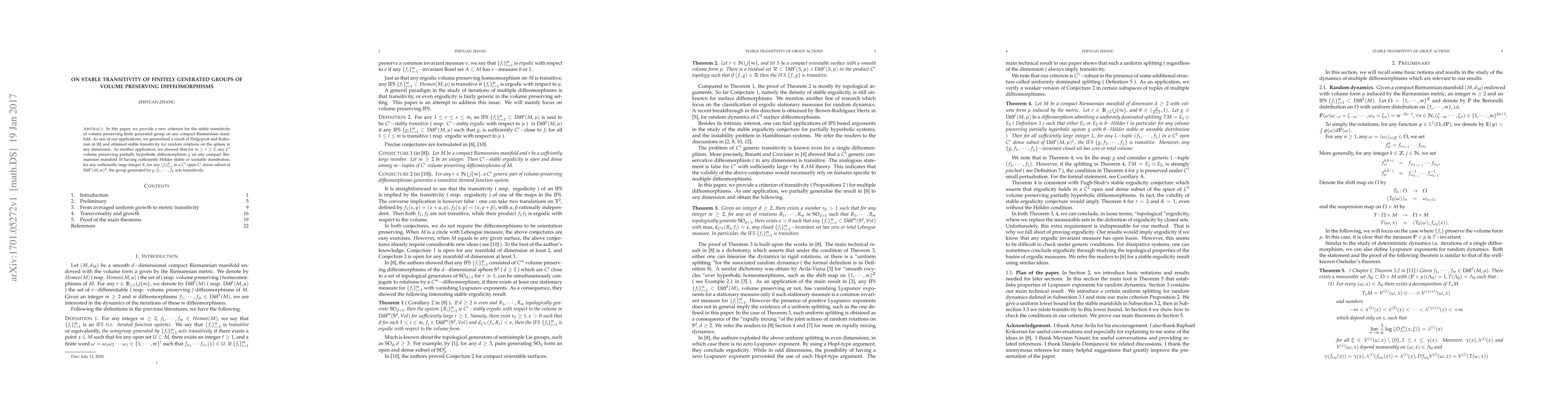 In this paper, we provide a new criterion for the stable transitivity of volume preserving finite generated group on any compact Riemannian manifold. As one of our applications, we generalised a result of Dolgopyat and Krikorian in \cite{DK} and obtained stable transitivity for random rotations on the sphere in any dimension. As another application, we showed that for $\infty \geq r \geq 2$, any $C^r$ volume preserving partially hyperbolic diffeomorphism $g$ on any compact Riemannian manifold $M$ having sufficiently H\"older stable or unstable distribution, for any sufficiently large integer $K$, for any $(f_i)_{i=1}^{K}$ in a $C^1$ open $C^r$ dense subset of $\textnormal{\Diff}^r(M,m)^K$, the group generated by $g, f_1,\cdots, f_K$ acts transitively.