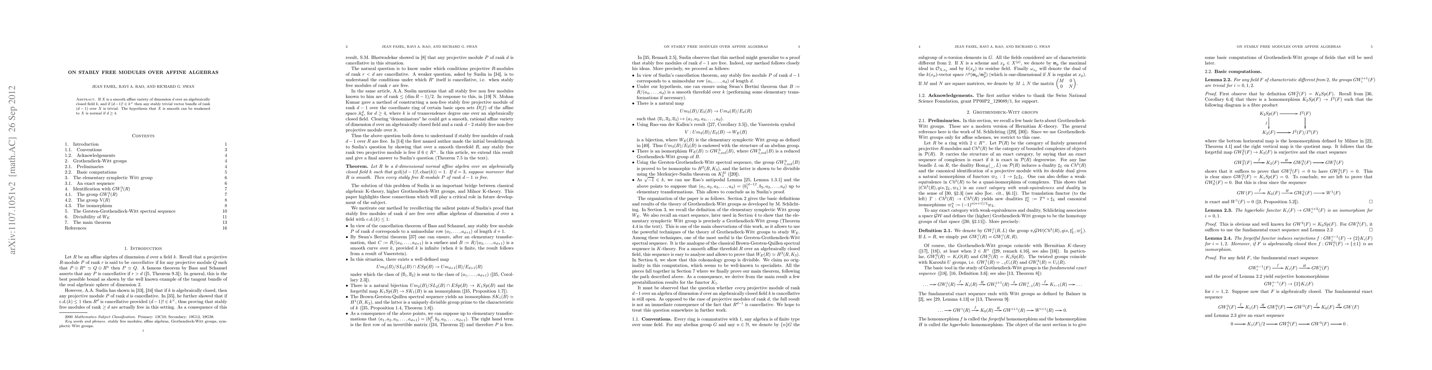 Summary: This paper demonstrates that stably free modules of rank d-1 over a smooth affine algebra of dimension d over an algebraically closed field k are free, under the condition that (d-1)! is nonzero in k. This result provides a significant classification of modules over such algebras.