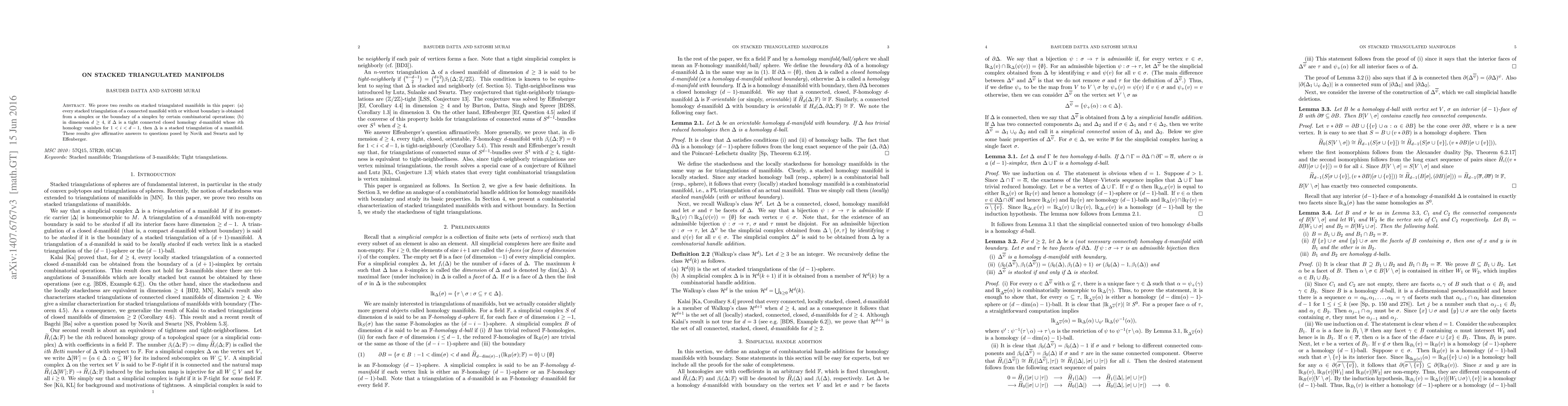 We prove two results on stacked triangulated manifolds in this paper: (a) every stacked triangulation of a connected manifold with or without boundary is obtained from a simplex or the boundary of a simplex by certain combinatorial operations; (b) in dimension $d \geq 4$, if $\Delta$ is a tight connected closed homology $d$-manifold whose $i$th homology vanishes for $1 < i < d-1$, then $\Delta$ is a stacked triangulation of a manifold.These results give affirmative answers to questions posed by Novik and Swartz and by Effenberger.