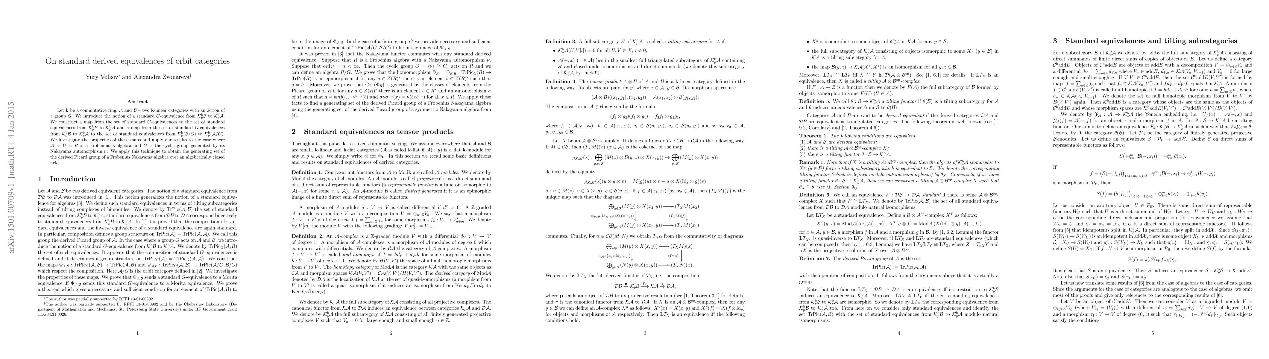 Let $\kk$ be a commutative ring, $\AAA$ and $\BB$ -- two $\kk$-linear categories with an action of a group $G$. We introduce the notion of a standard $G$-equivalence from $\Kb\BB$ to $\Kb\AAA$. We construct a map from the set of standard $G$-equivalences to the set of standard equivalences from $\Kb\BB$ to $\Kb\AAA$ and a map from the set of standard $G$-equivalences from $\Kb\BB$ to $\Kb\AAA$ to the set of standard equivalences from $\Kb(\BB/G)$ to $\Kb(\AAA/G)$. We investigate the properties of these maps and apply our results to the case where $\AAA=\BB=R$ is a Frobenius $\kk$-algebra and $G$ is the cyclic group generated by its Nakayama automorphism $\nu$. We apply this technique to obtain the generating set of the derived Picard group of a Frobenius Nakayama algebra over an algebraically closed field.