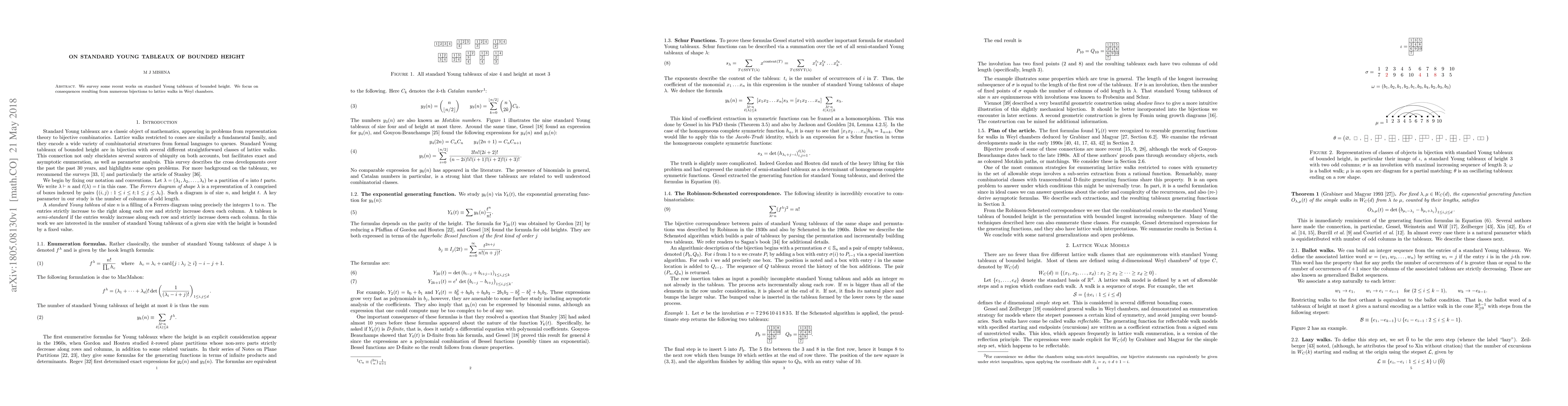 We survey some recent works on standard Young tableaux of bounded height. We focus on consequences resulting from numerous bijections to lattice walks in Weyl chambers.
