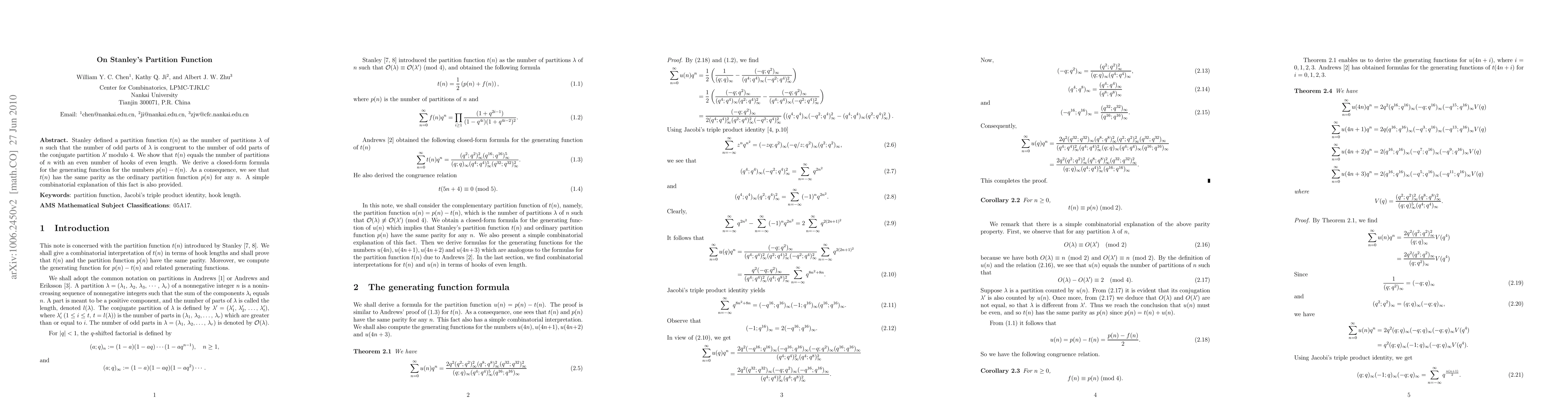 The paper shows that Stanley's partition function t(n) equals the number of partitions of n with an even number of hooks of even length, proving its parity is the same as the ordinary partition function p(n).
