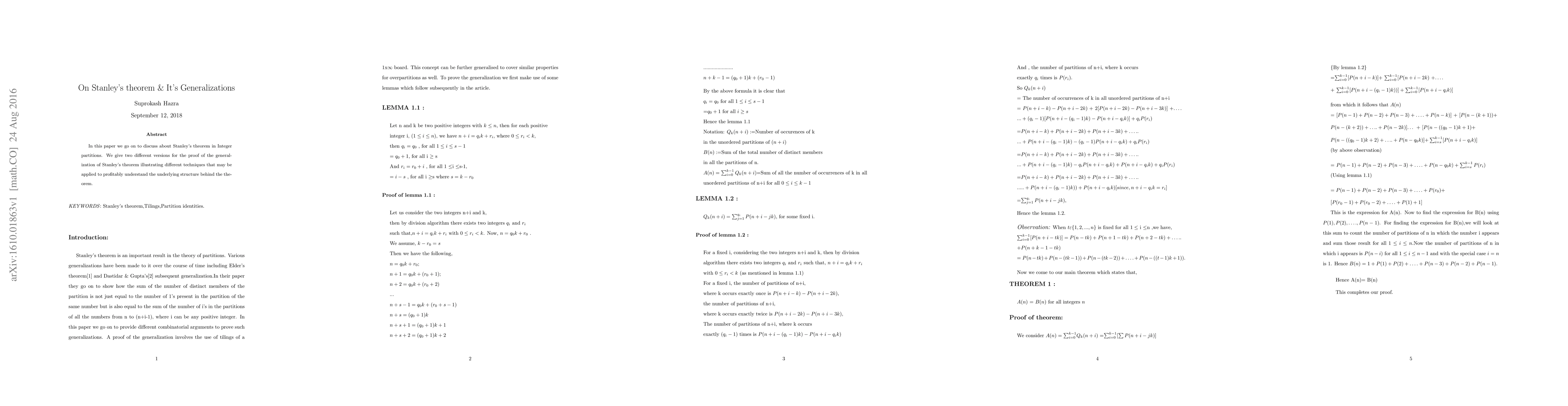 Two-line summary: This paper explores Stanley's theorem on integer partitions, presenting two distinct proofs for its generalization to highlight different techniques that reveal the underlying structural insights of the theorem. The diverse approaches aim to enhance understanding and application of the theorem.