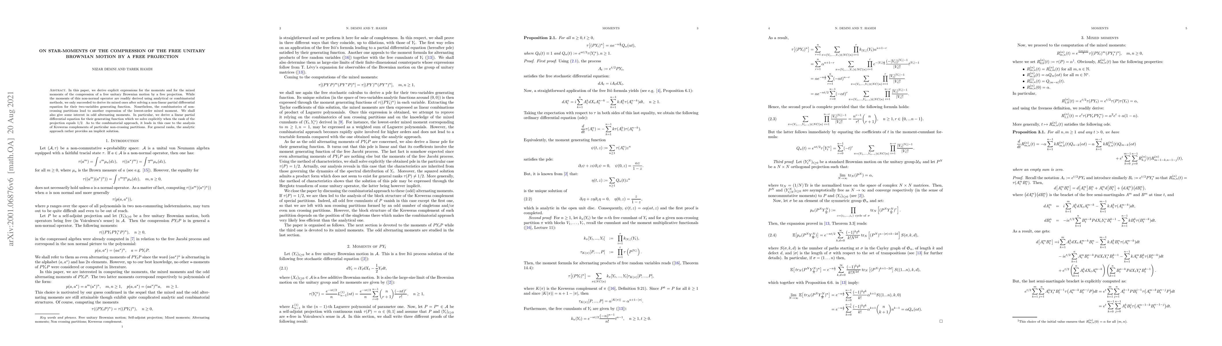 In this paper, we derive explicit expressions for the moments and for the mixed moments of the compression of a free unitary Brownian motion by a free projection. While the moments of this non-normal operator are readily derived using analytical or combinatorial methods, we only succeeded to derive its mixed ones after solving a non-linear partial differential equation for their two-variables generating function. Nonetheless, the combinatorics of non crossing partitions lead to another expression of the lowest-order mixed moment. We shall also give some interest in odd alternating moments. In particular, we derive a linear partial differential equation for their generating function and discuss the combinatorial approach to these moments when the rank of the projection equals $1/2$.