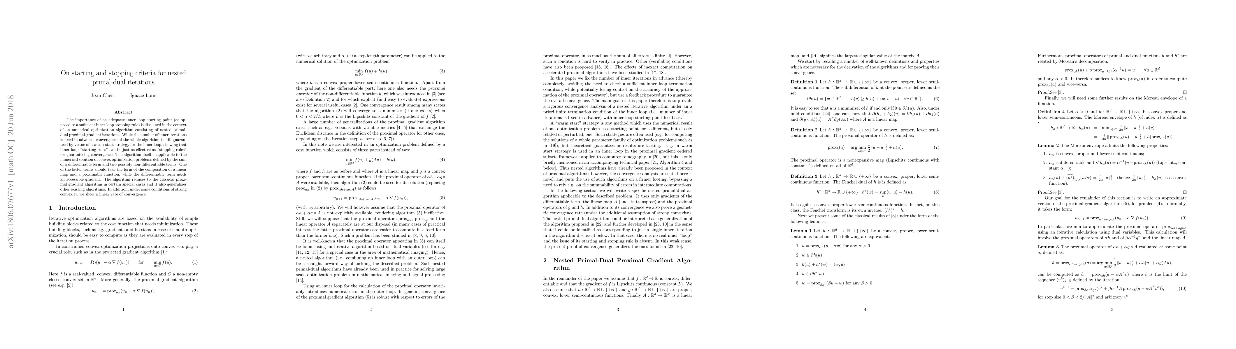 This paper discusses the significance of starting criteria for nested primal-dual proximal-gradient iterations in optimization algorithms, demonstrating that starting rules can be as effective as stopping rules for convergence. The algorithm applies to convex optimization problems and generalizes existing methods, showing linear convergence under strong convexity.