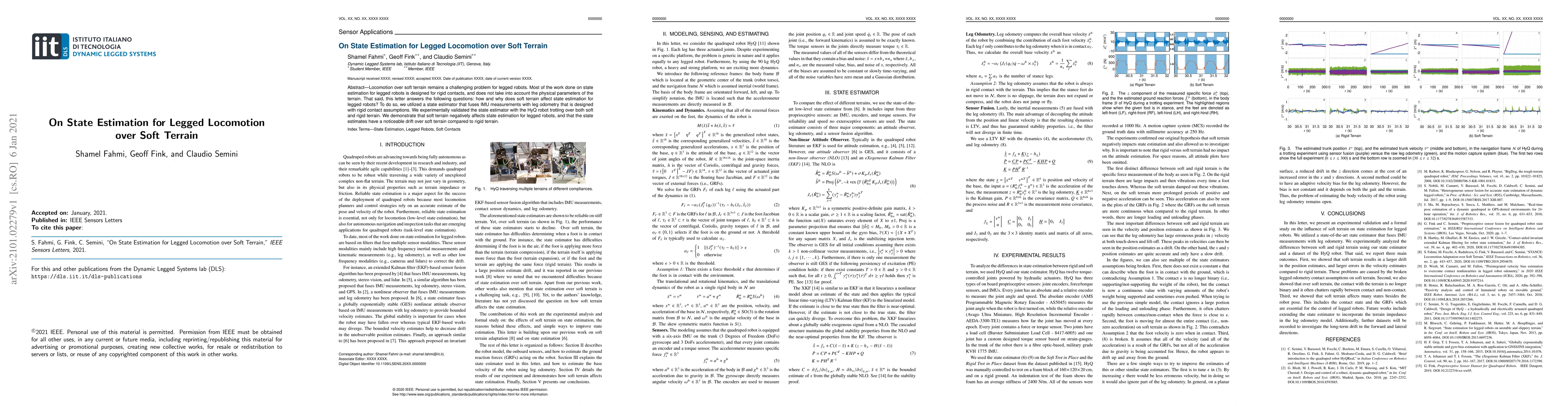 This paper investigates the impact of soft terrain on state estimation for legged robots, demonstrating that soft terrain leads to significant drift in state estimates compared to rigid terrain. The study uses a state estimator that fuses IMU and leg odometry data, validated through experiments with the HyQ robot on both soft and rigid terrains.